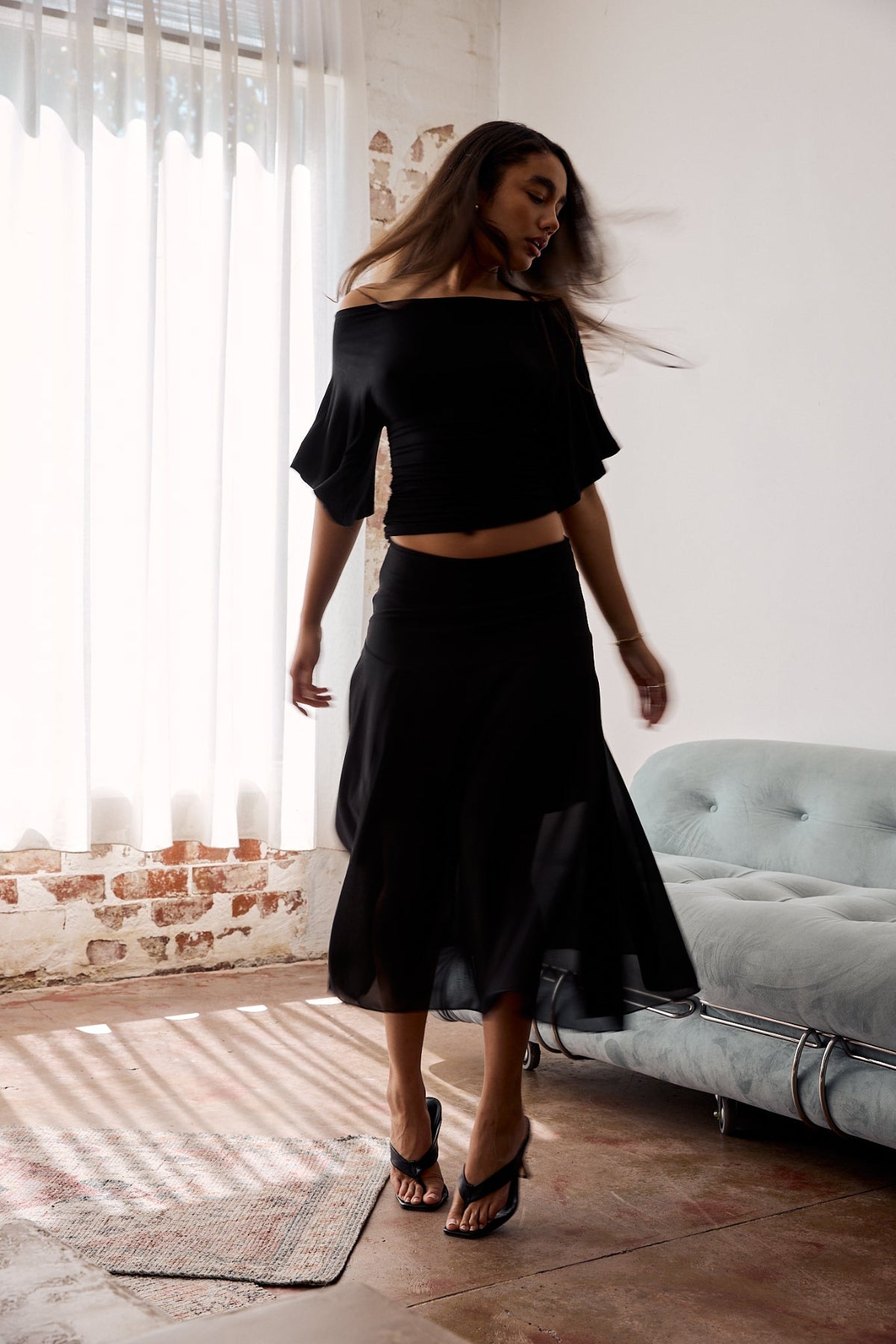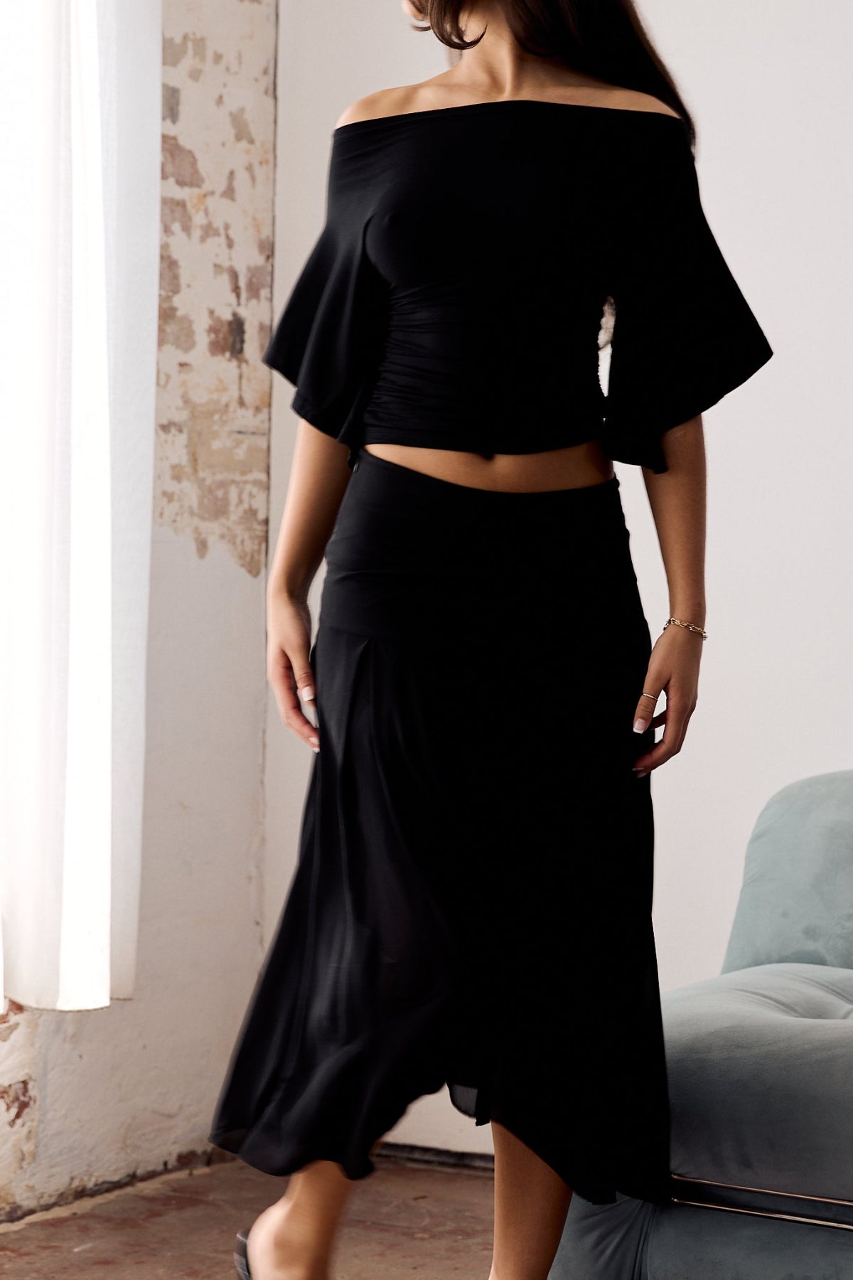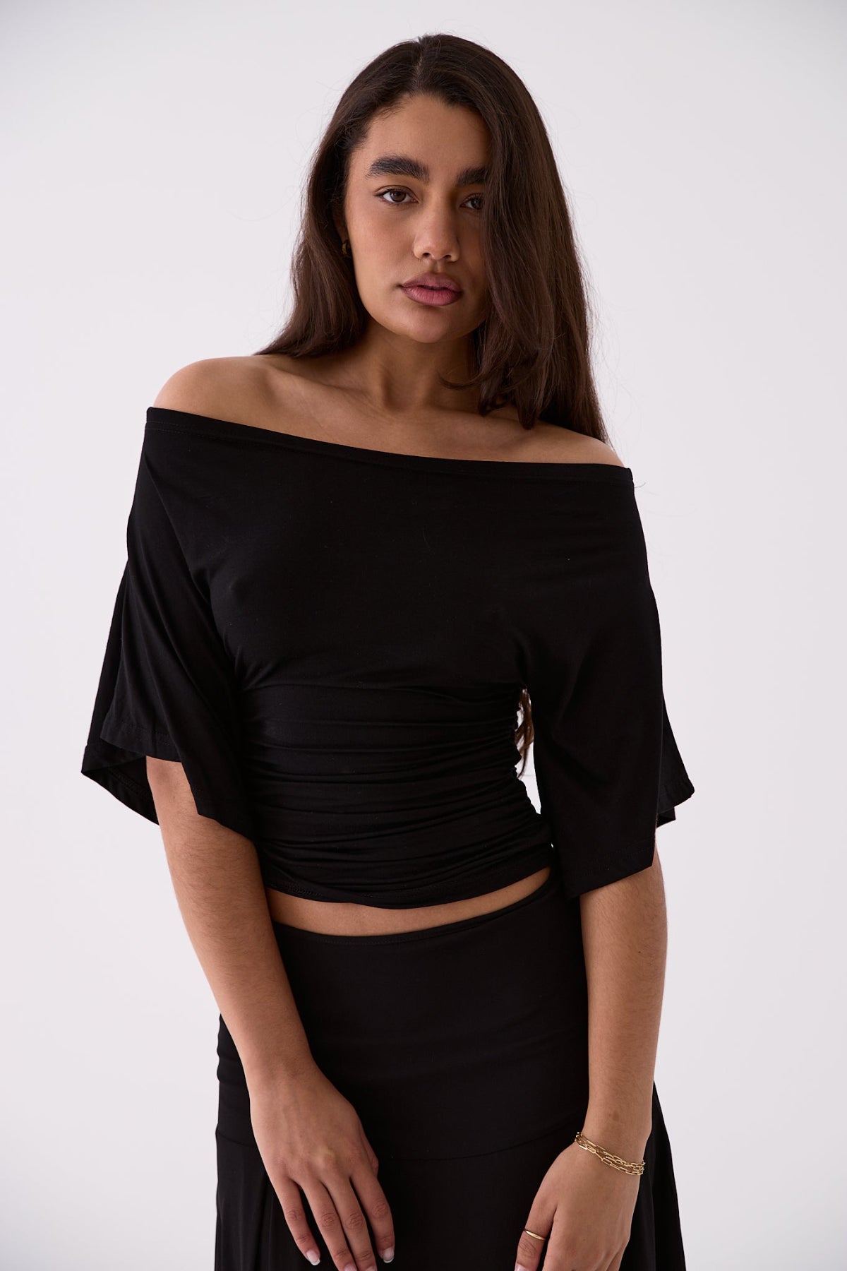 The Aria Top features a wide neckline, soft flutter sleeves, and subtle ruching through the waist for a flattering, form-skimming fit.