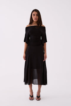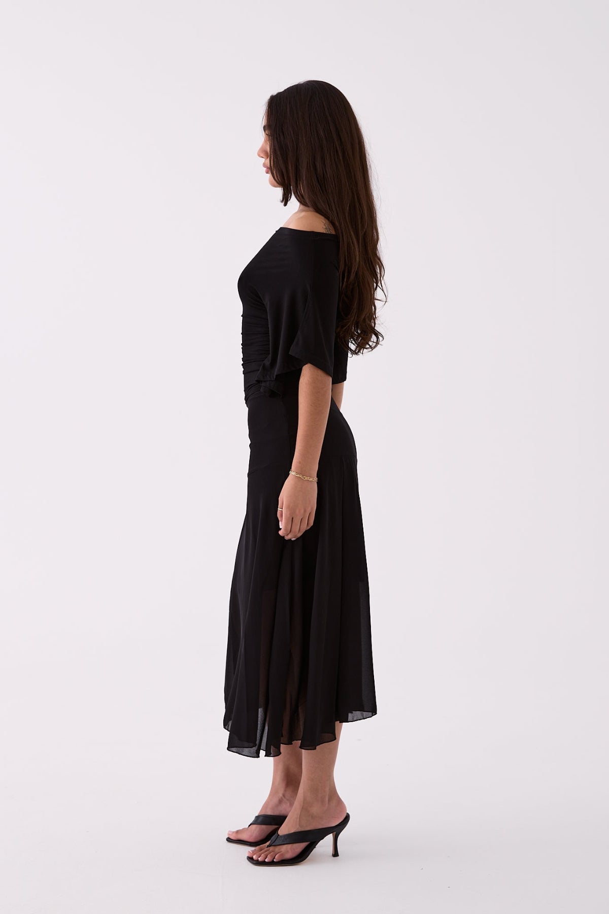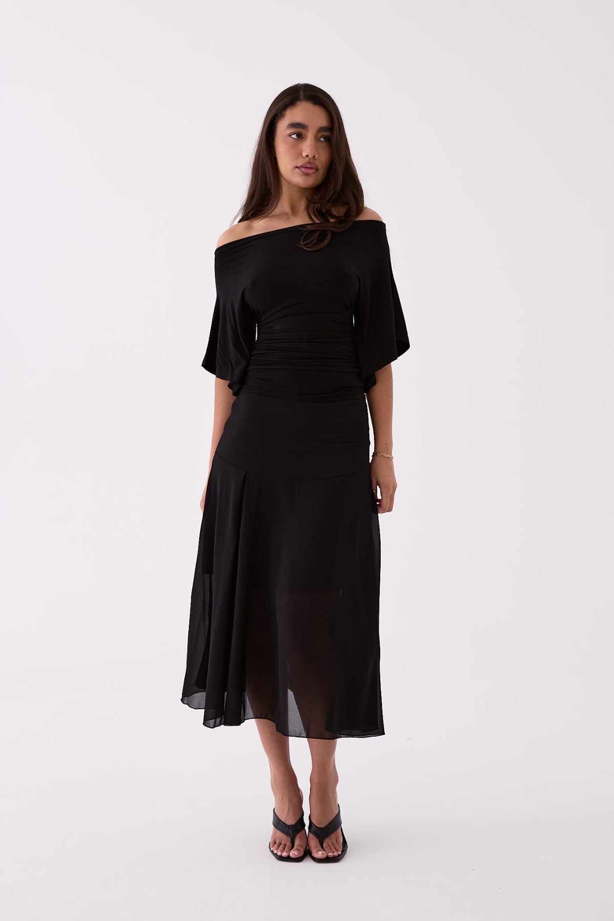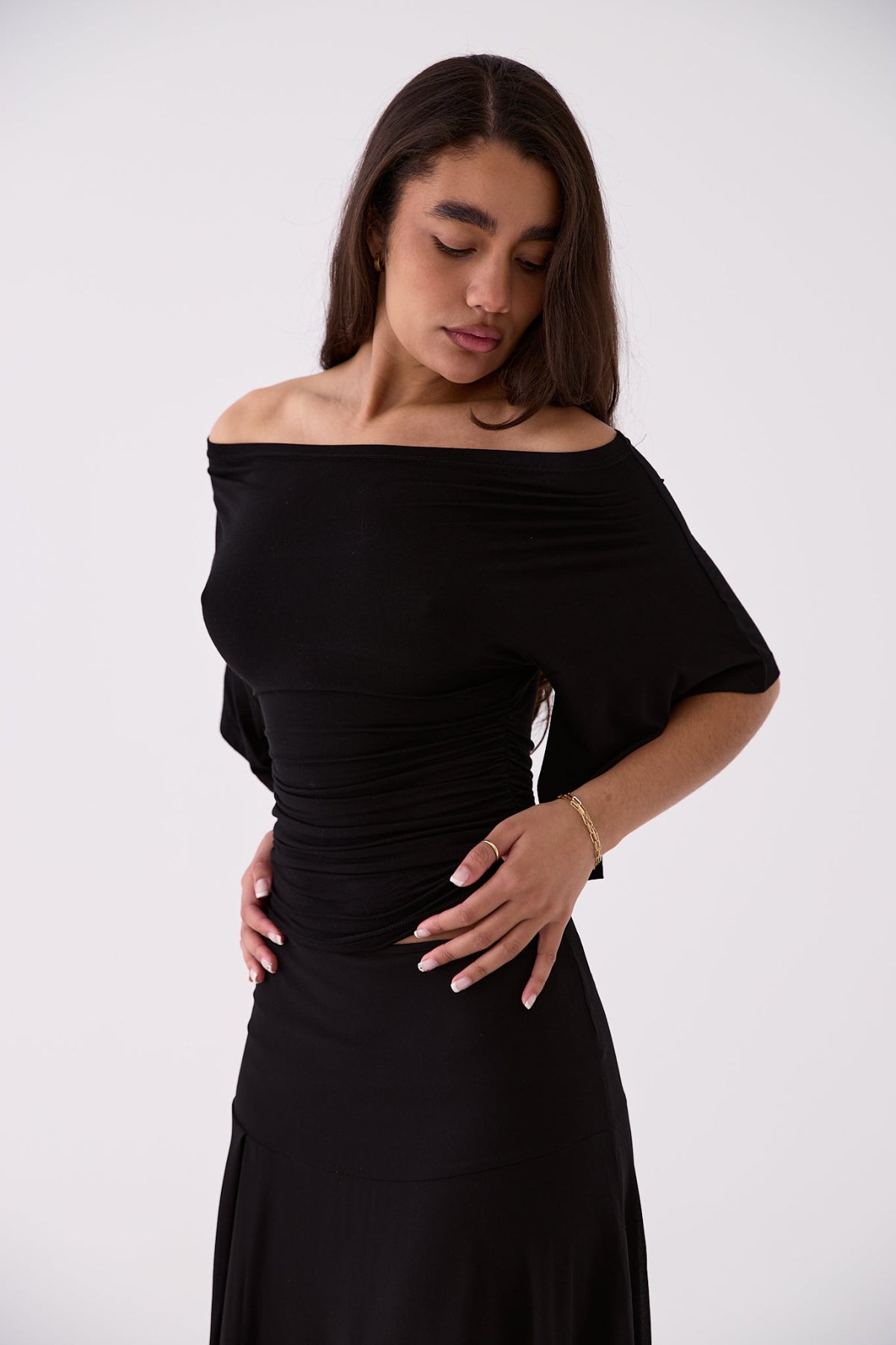 The Aria Top features a wide neckline, soft flutter sleeves, and subtle ruching through the waist for a flattering, form-skimming fit.