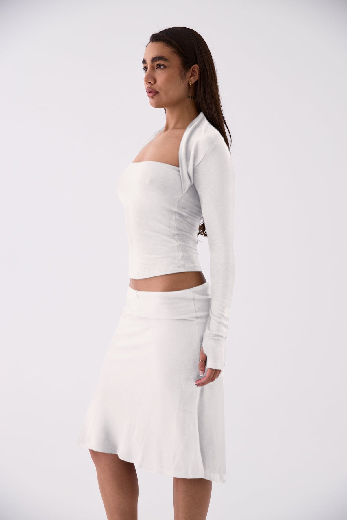 The Aven Top features a fitted bandeau-style bodice paired with an attached shrug sleeve for a refined, contemporary silhouette. Crafted from a soft stretch fabrication, it’s the perfect balance of minimal and bold.