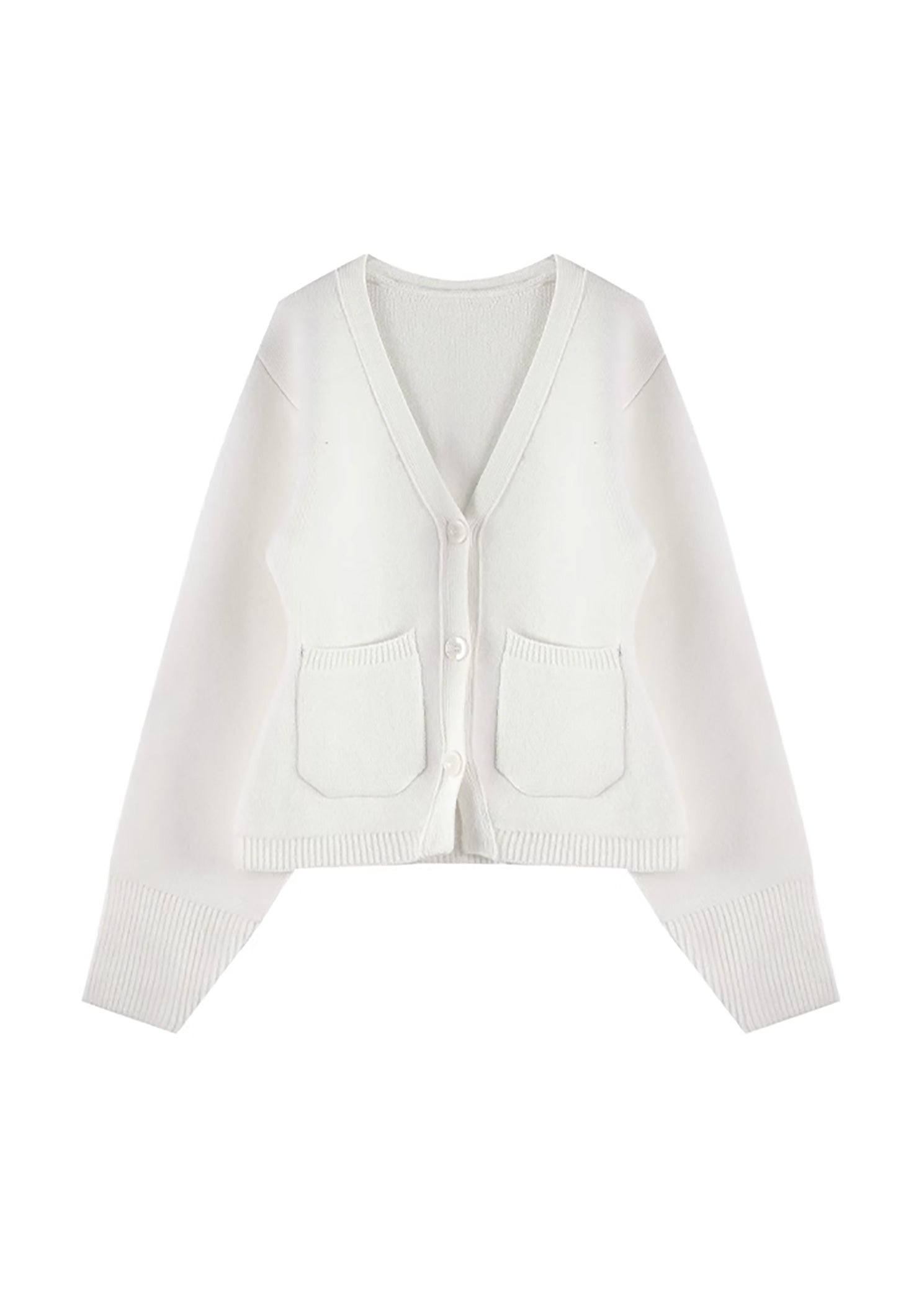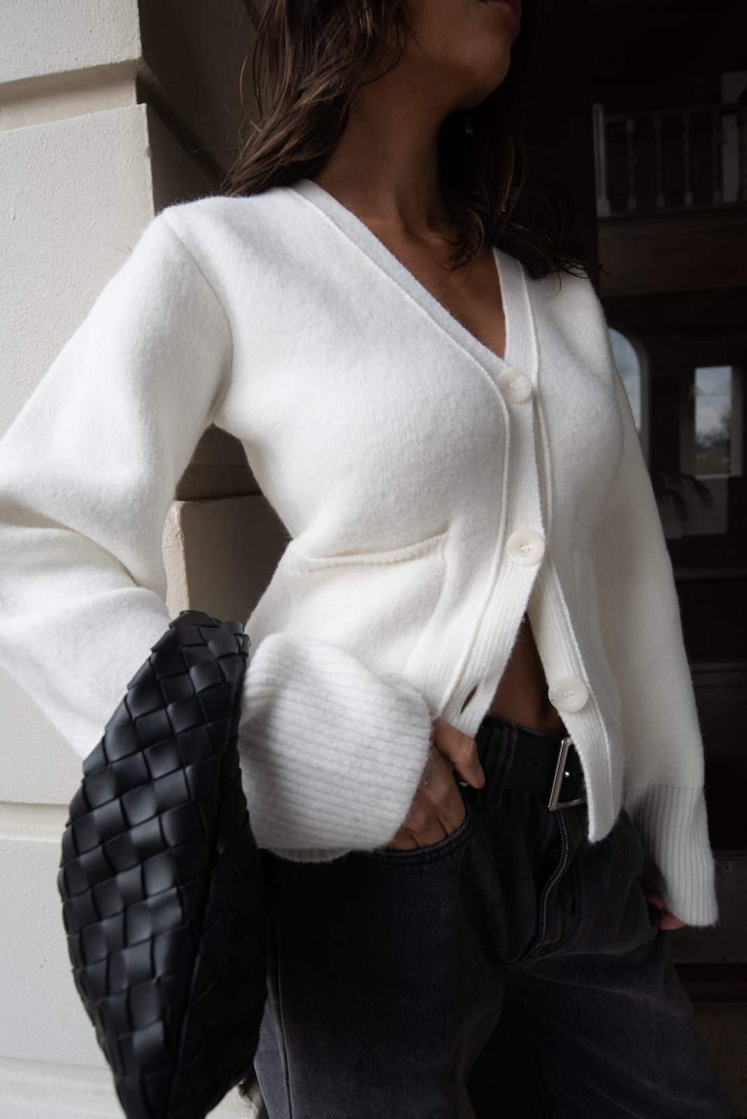 This cozy Courtney Cardigan - White, is the perfect blend of function and style. Crafted from a wool-blend chunky knit, it features front button closure, convenient front pockets, slightly balloon sleeves and cinched waist