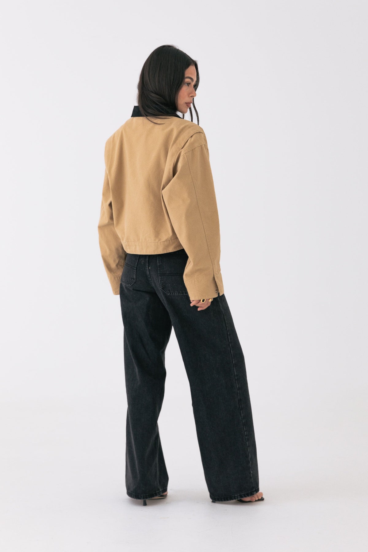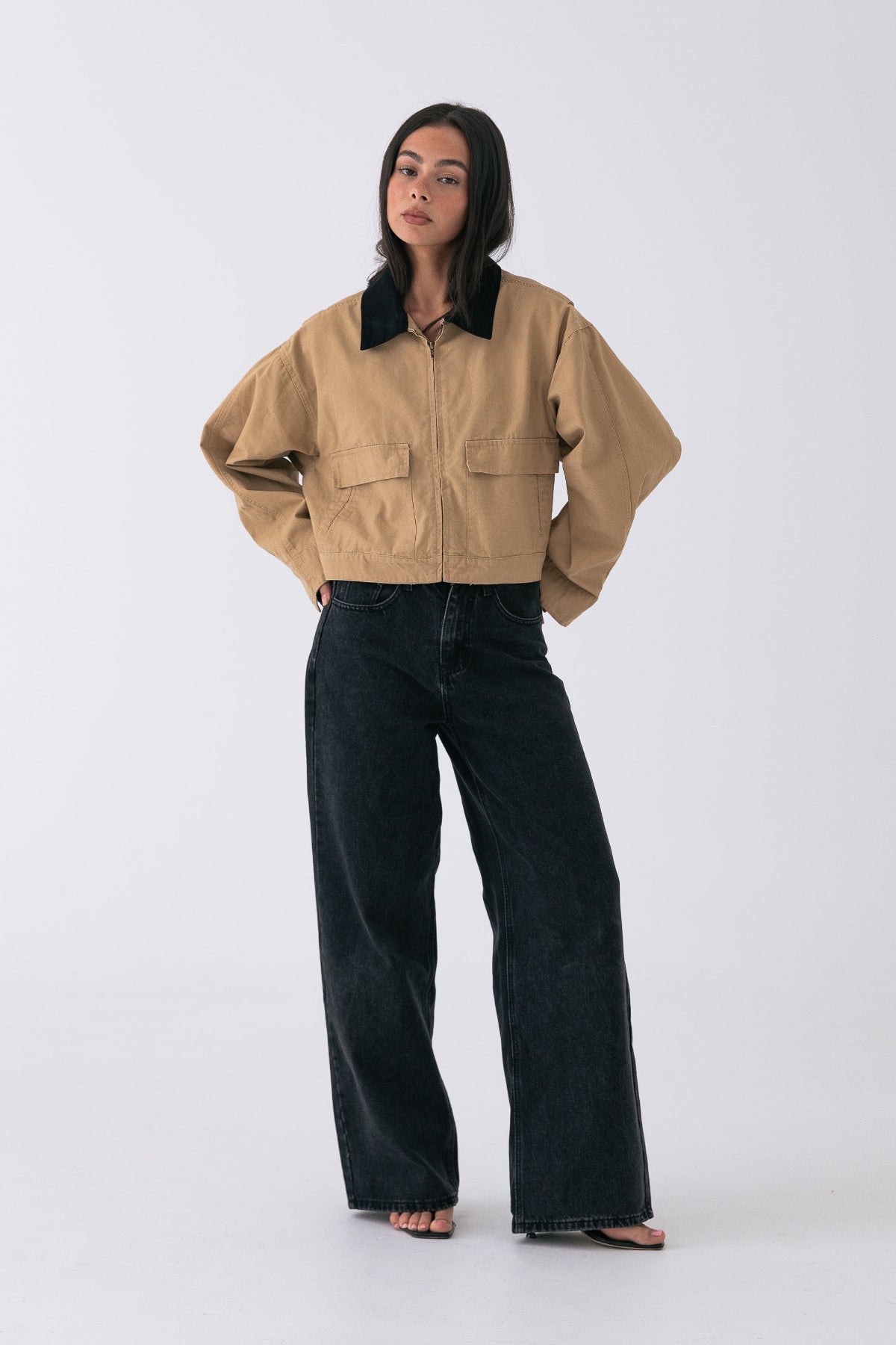 Your new off-duty layer. This cropped utility jacket features a boxy fit, oversized front pockets, and a contrast collar for subtle edge. Made from structured cotton for that clean, effortless look.