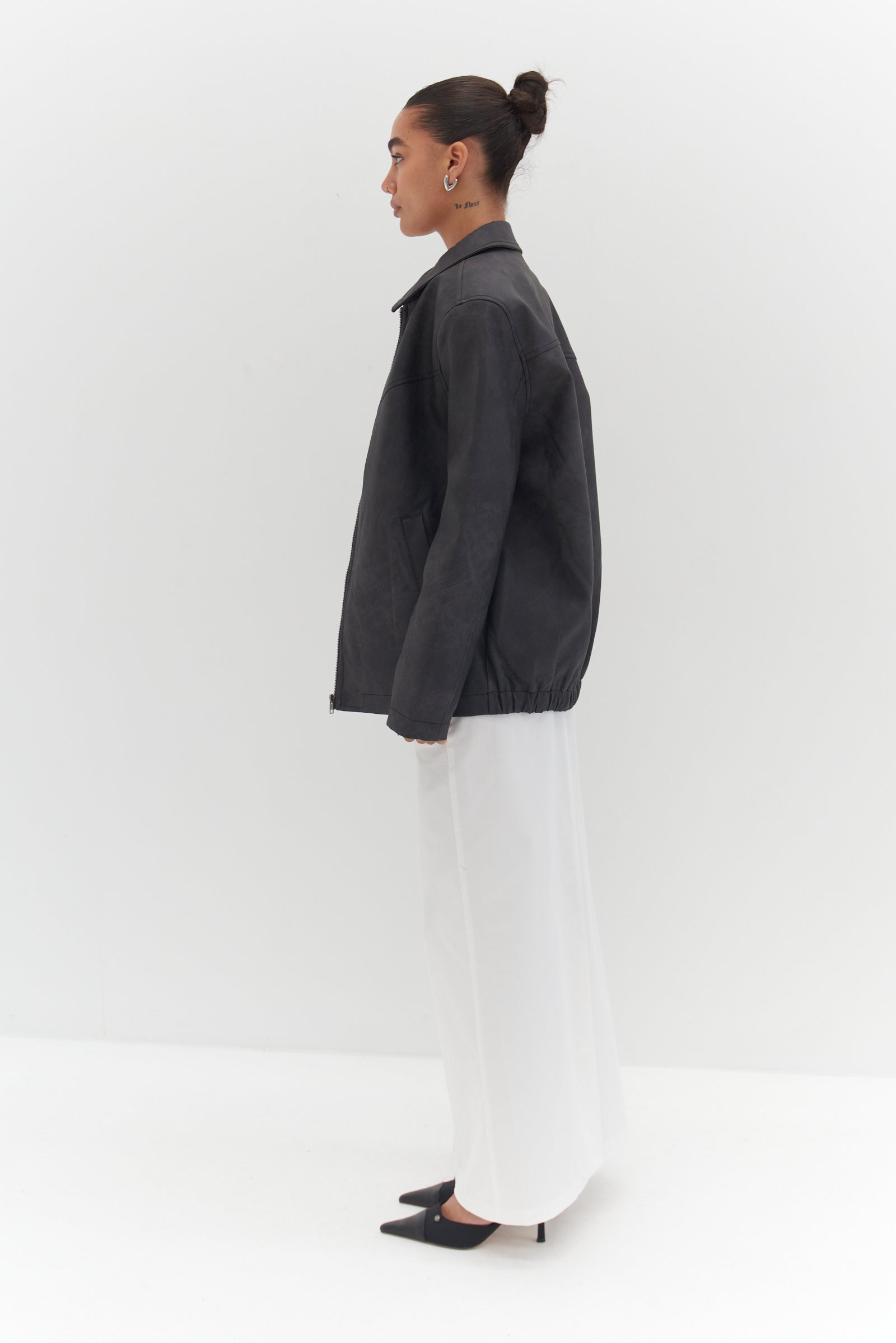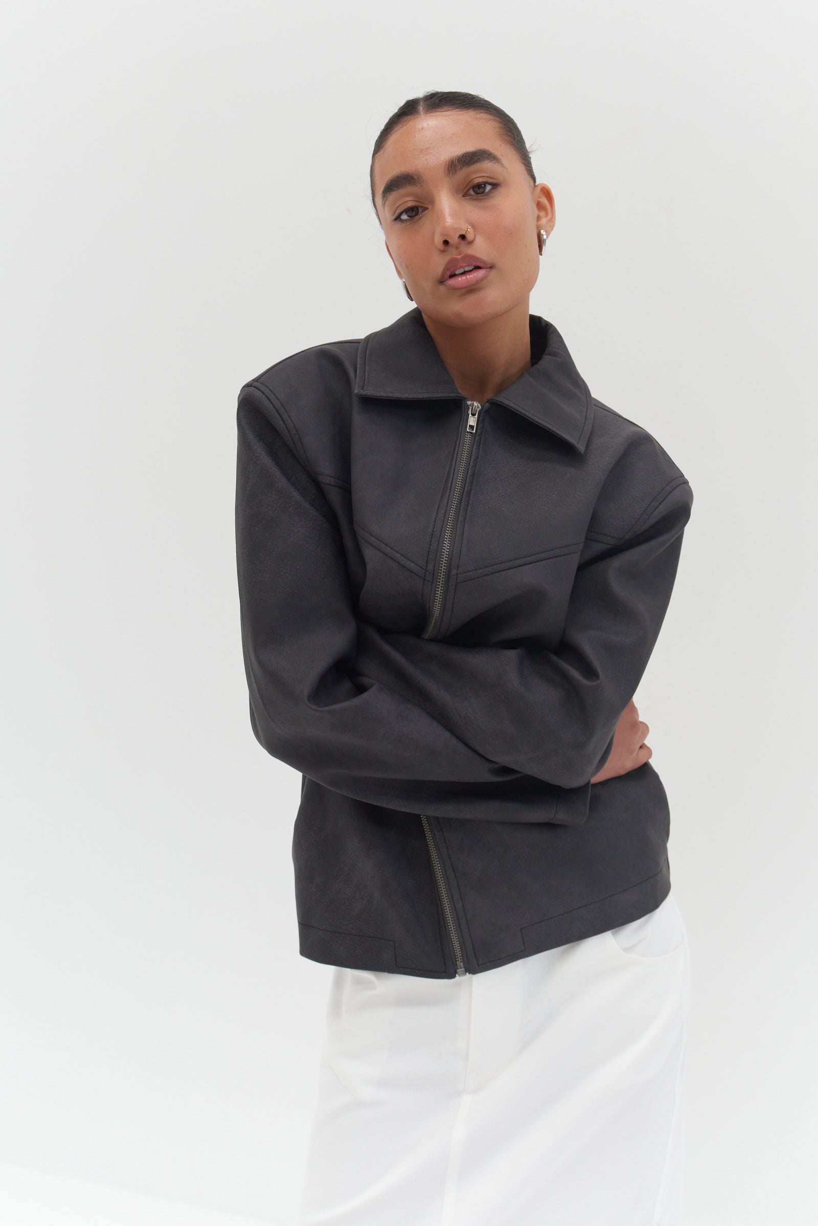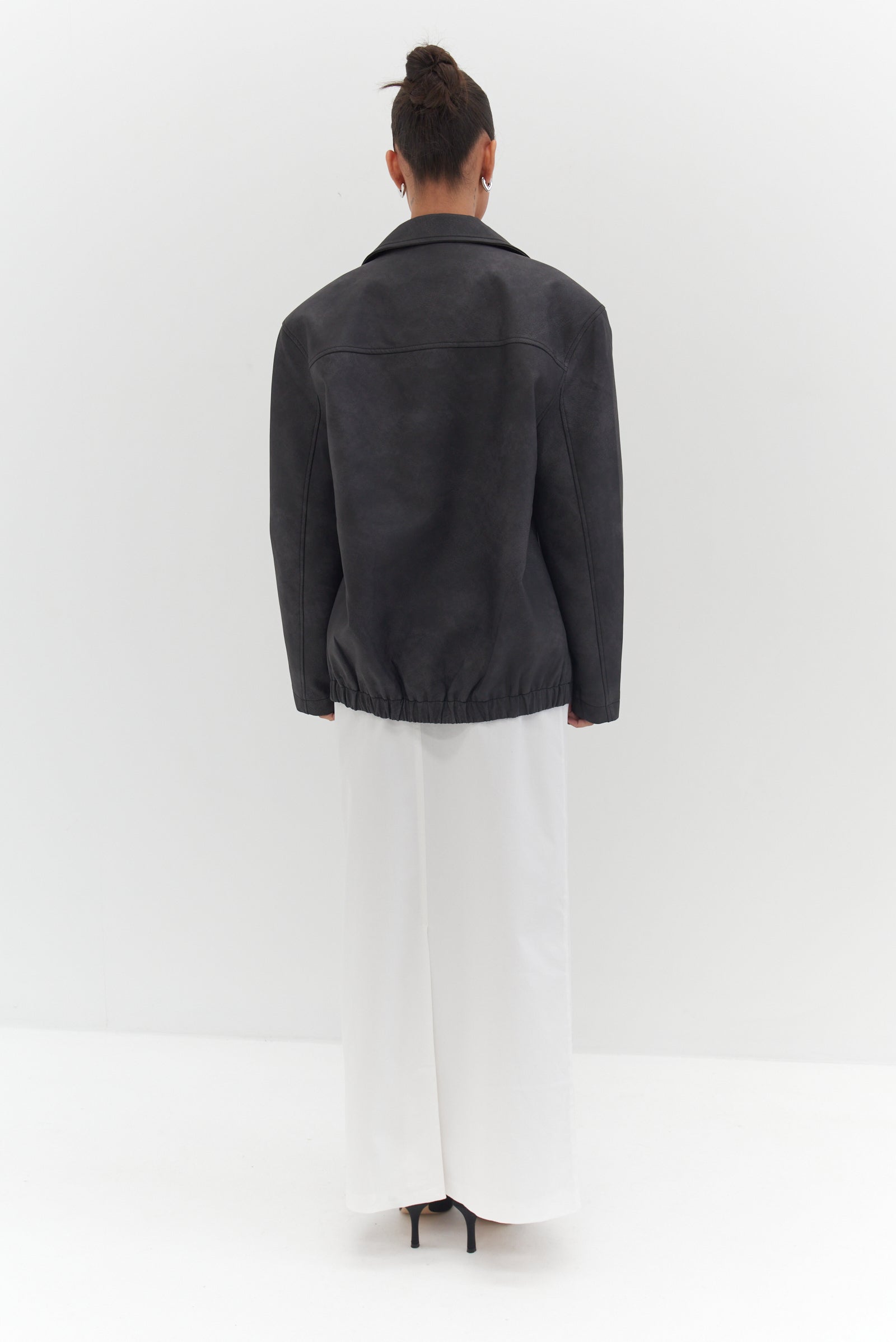 Introducing the Debut Jacket, a vintage-inspired piece perfect for your wardrobe. Its oversized fit and washed black color give it a classic look, while the silver hardware adds a touch of edge. The elasticized back and fully lined interior provide comfort and functionality, complete with two side pockets.