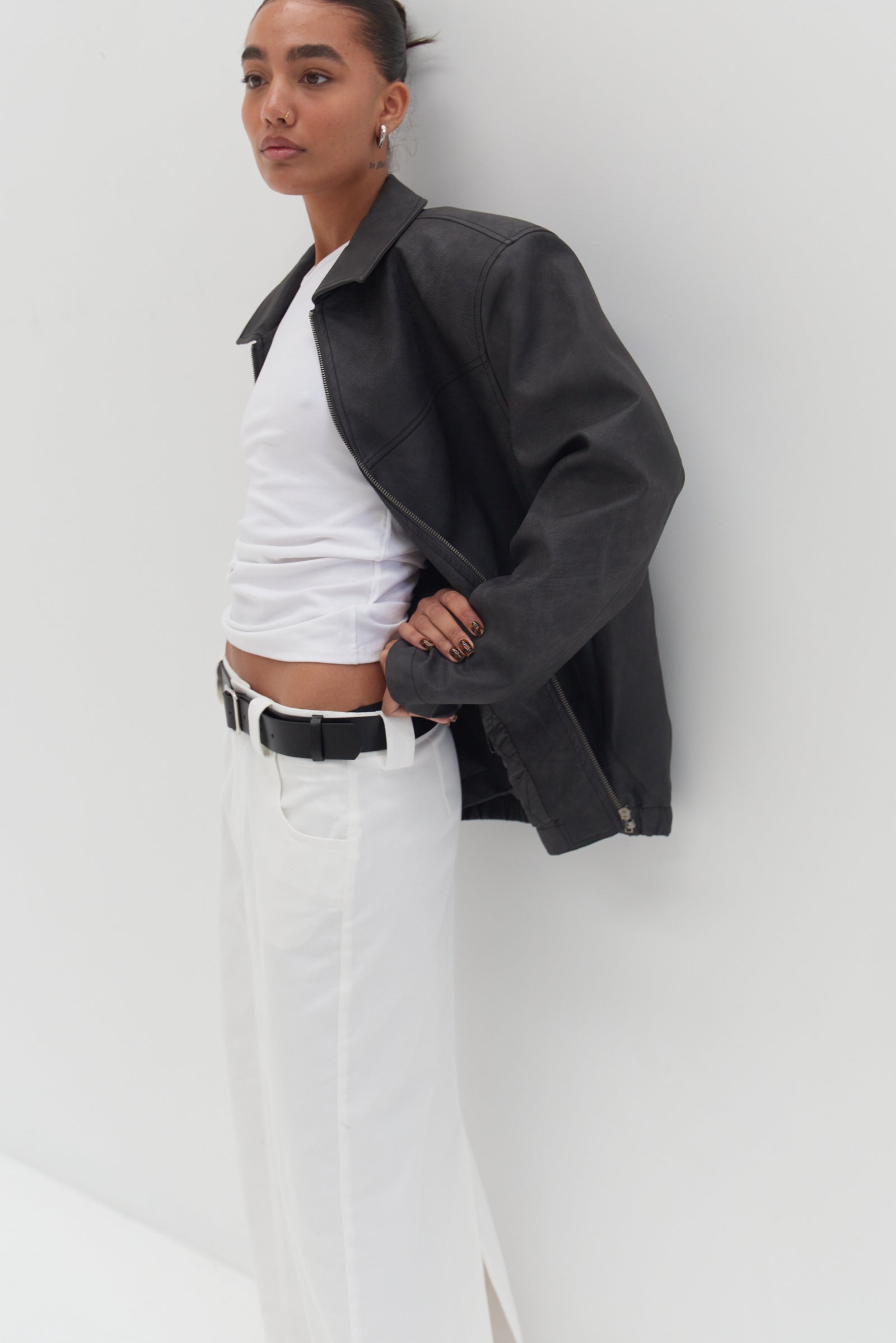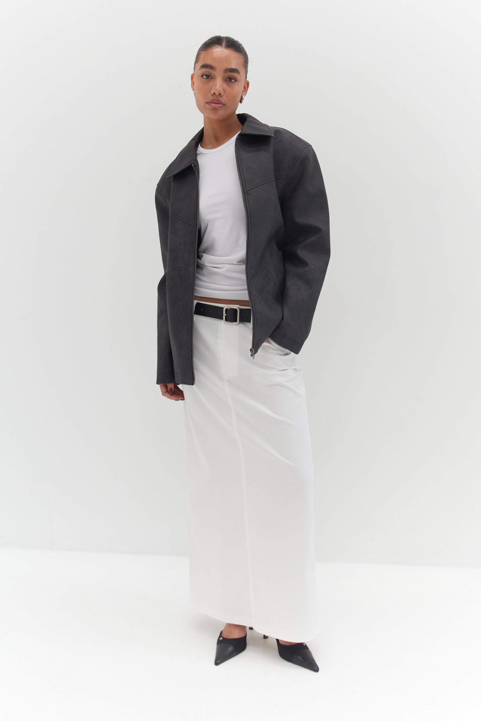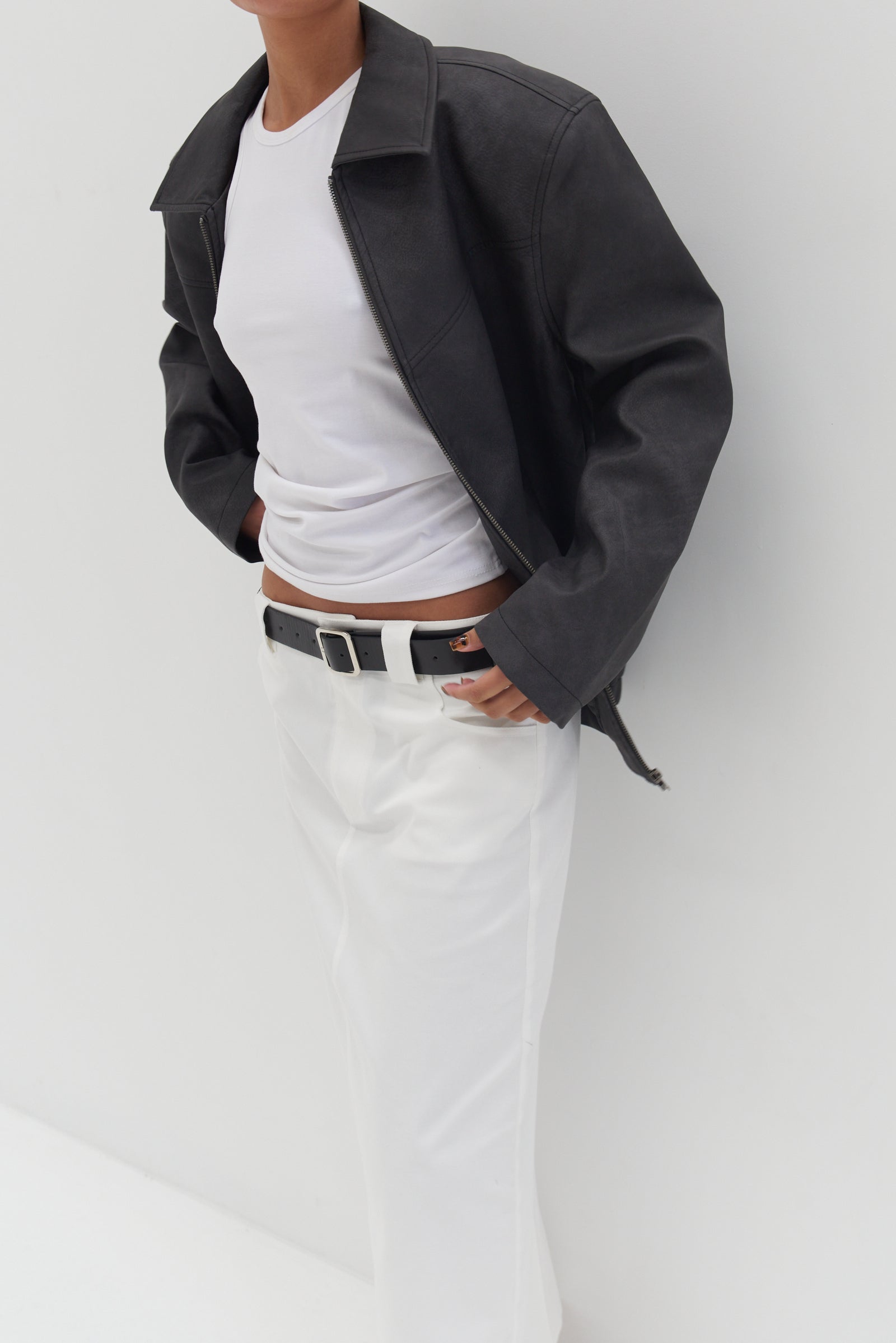 Introducing the Debut Jacket, a vintage-inspired piece perfect for your wardrobe. Its oversized fit and washed black color give it a classic look, while the silver hardware adds a touch of edge. The elasticized back and fully lined interior provide comfort and functionality, complete with two side pockets.