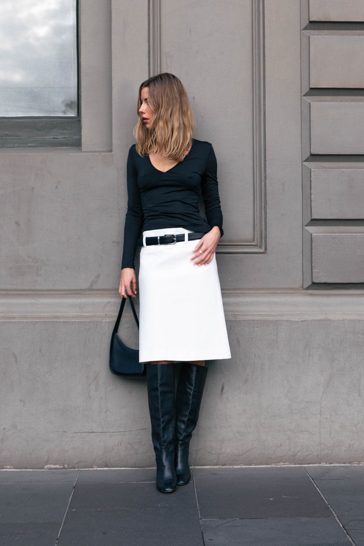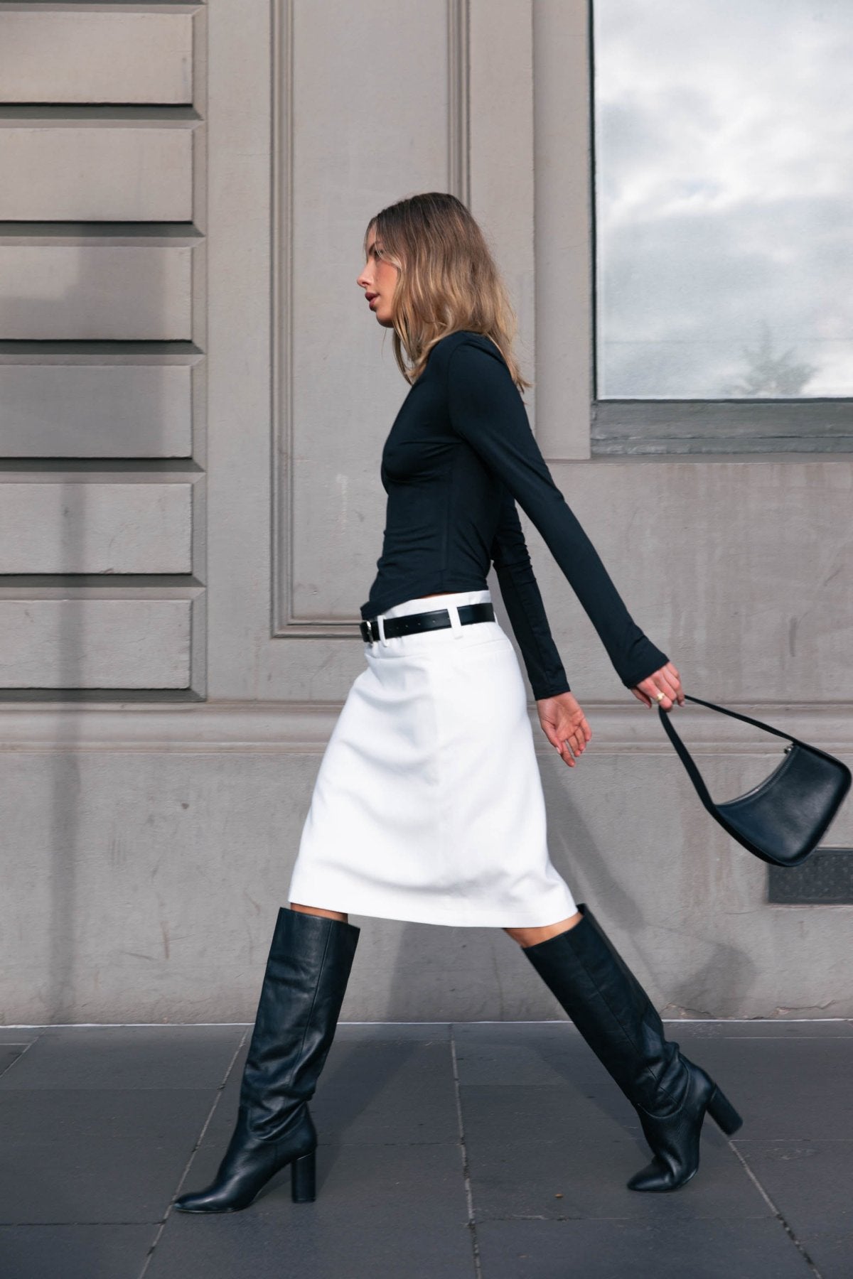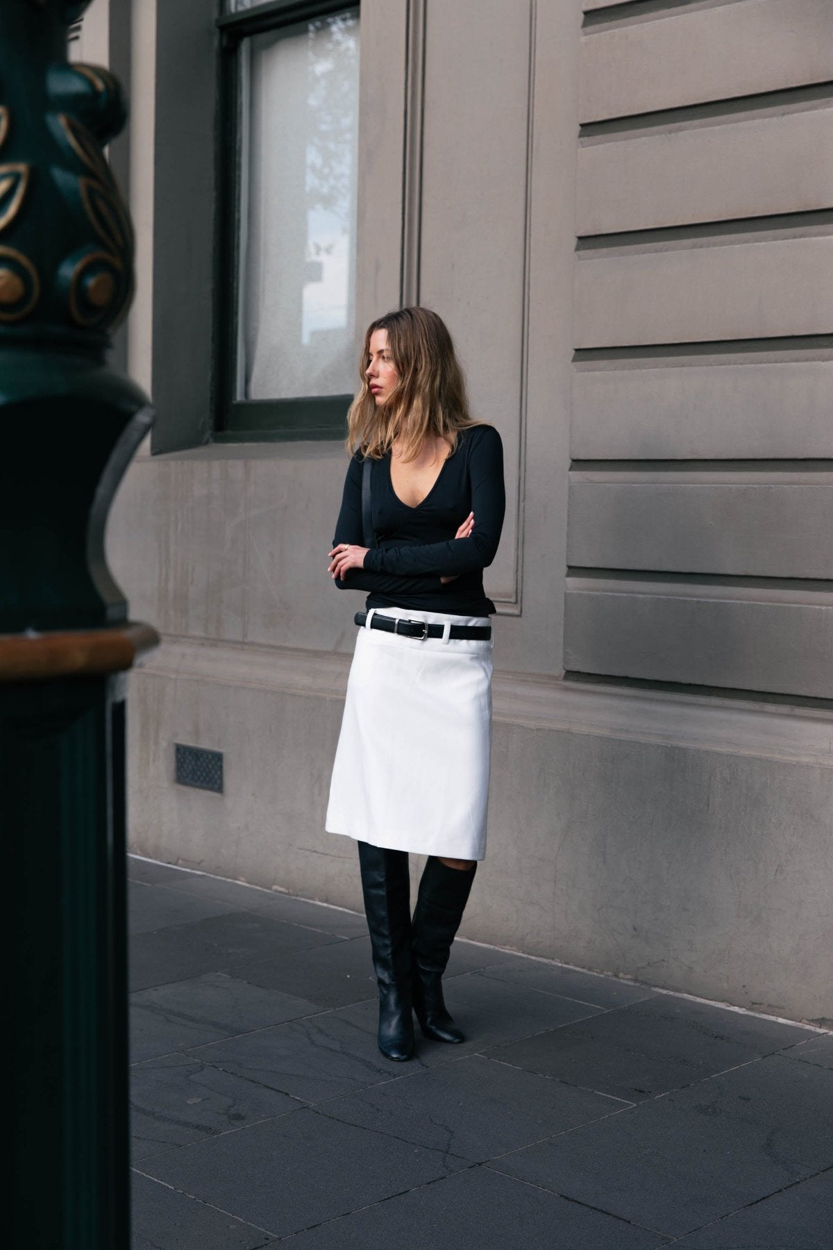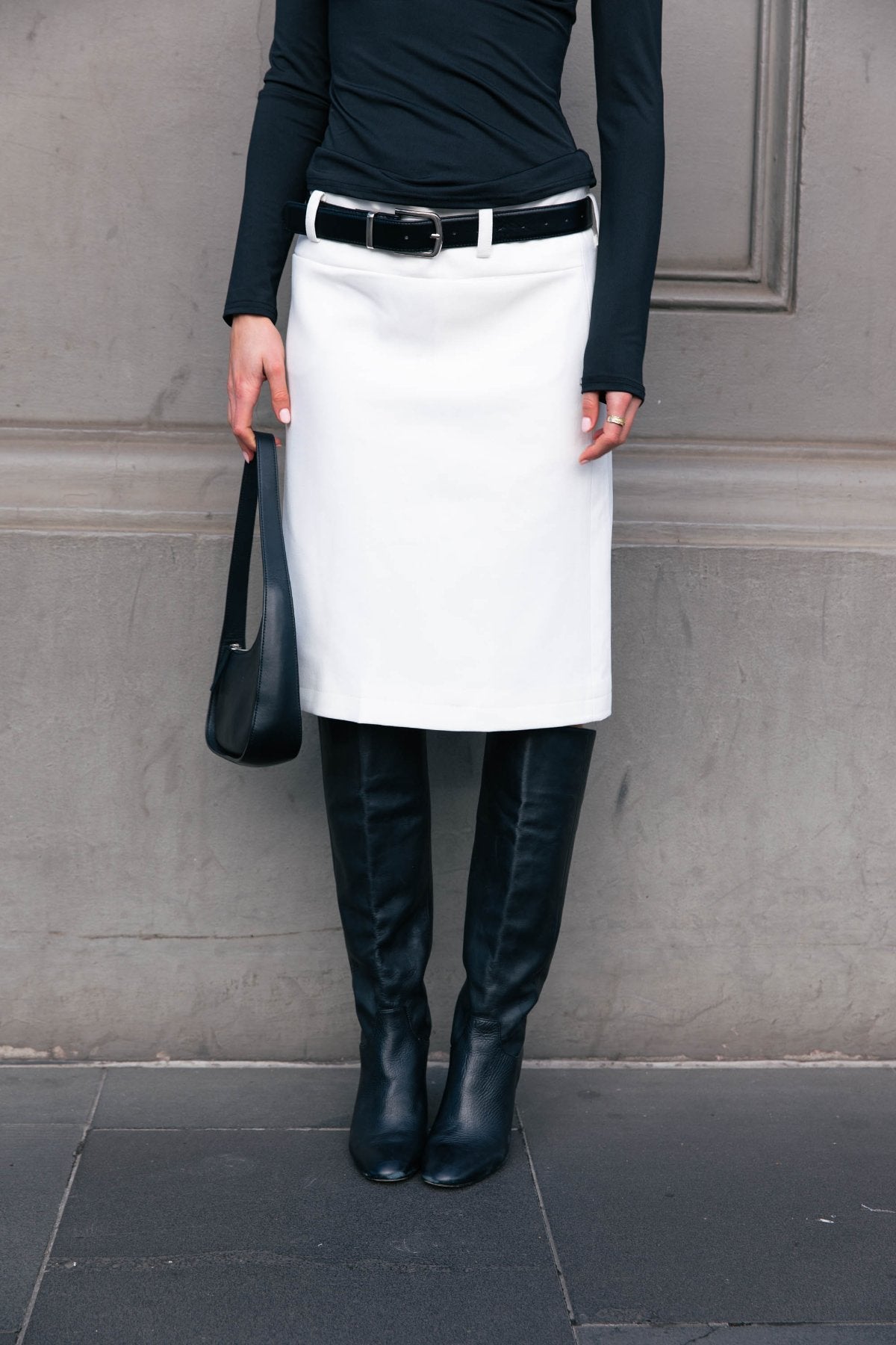 Introducing the Frankie Belted Skirt. This mid-length skirt features a classic pencil silhouette, with a hidden side zip closure. It also comes with a belt which can be removed. Perfect for any occasion, dress it up or down for a timeless and effortless look.