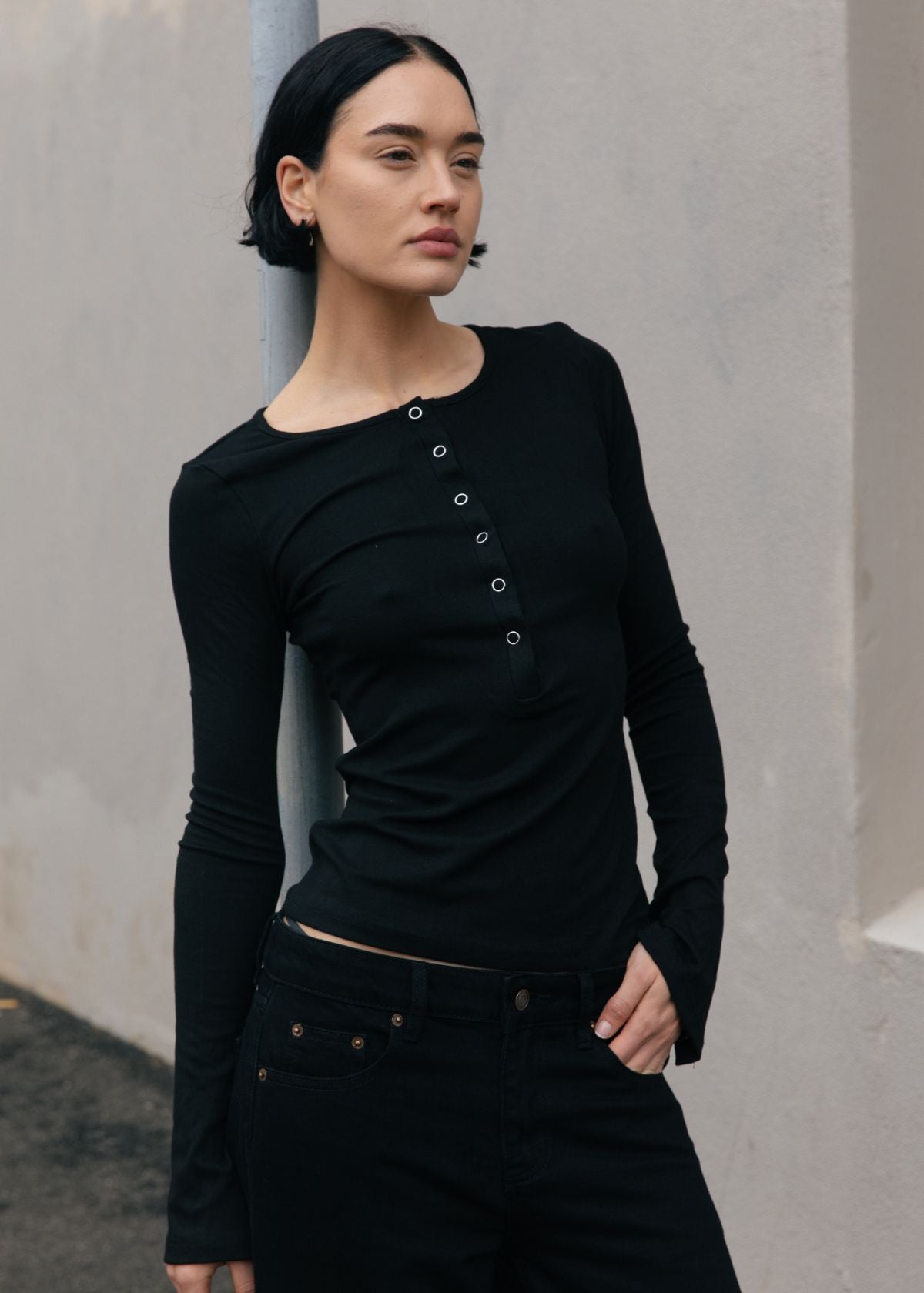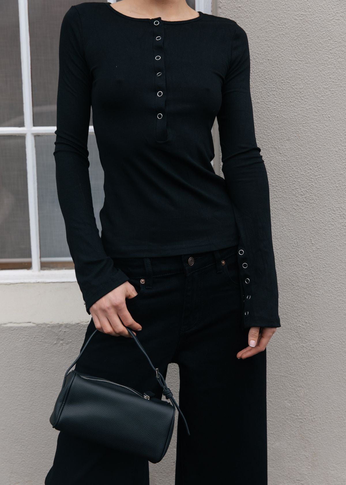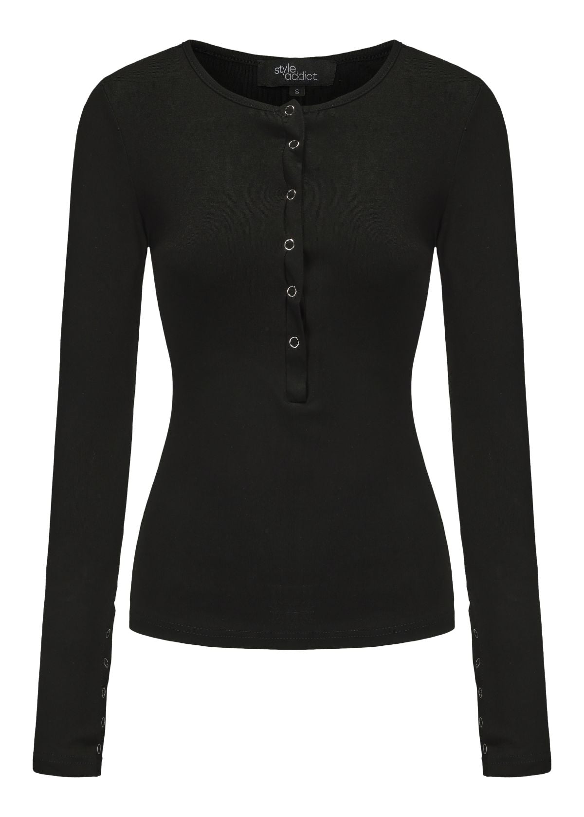 Introducing the Isobel Long Sleeve Top in black. Made from super soft stretch fabric for maximum comfort. It features adjustable snap button front and sleeves.
