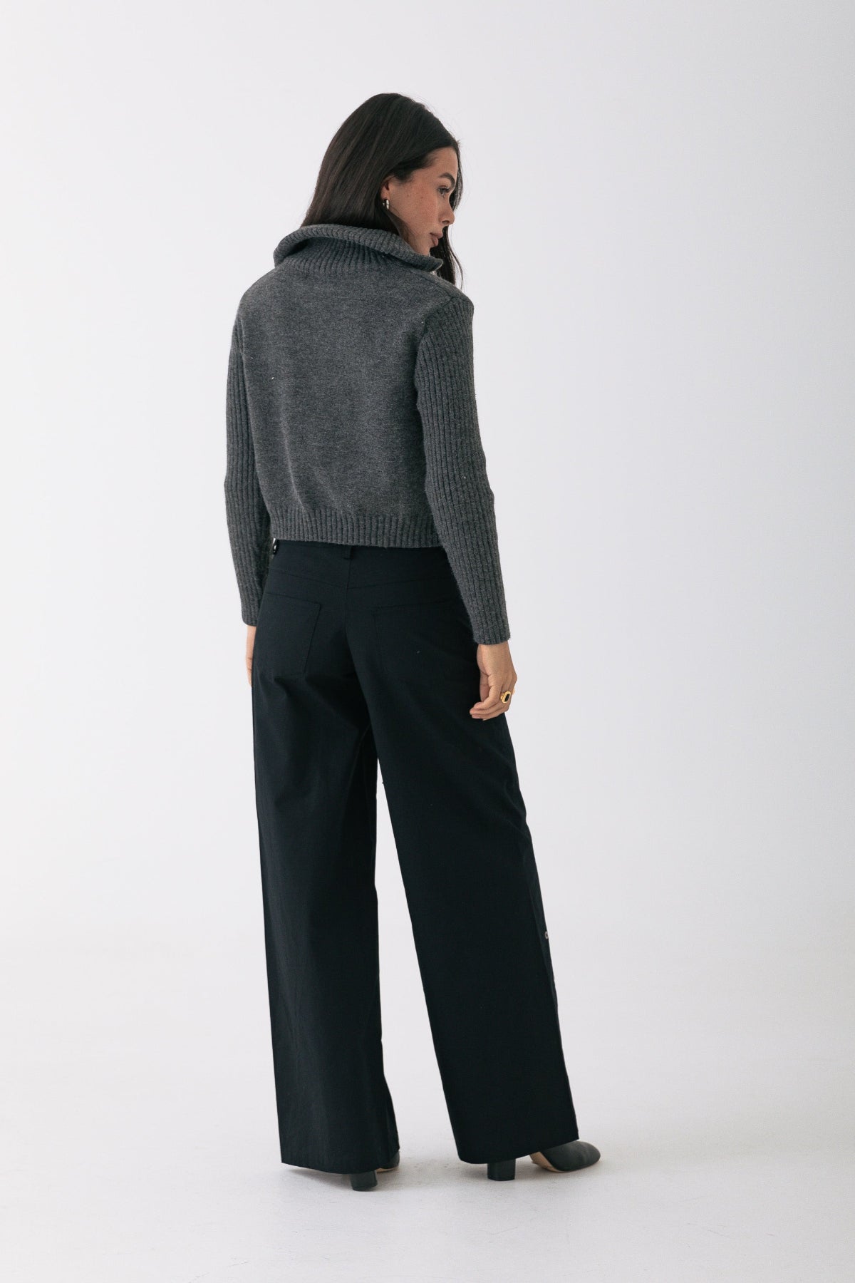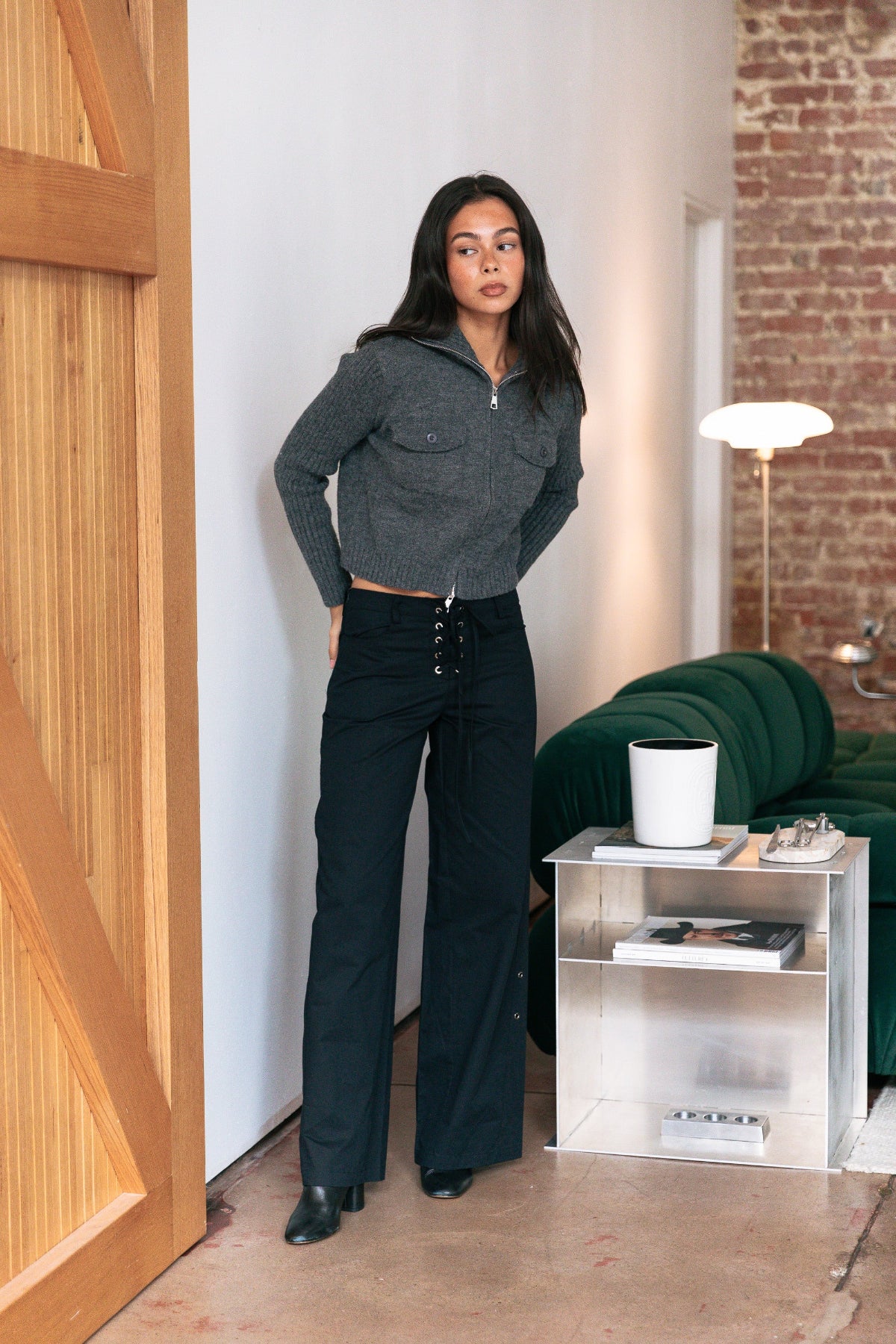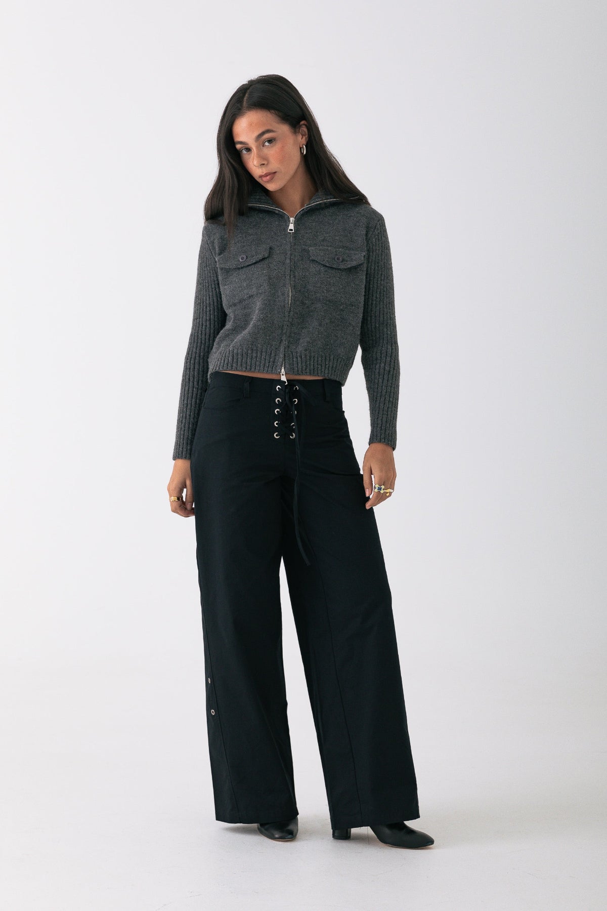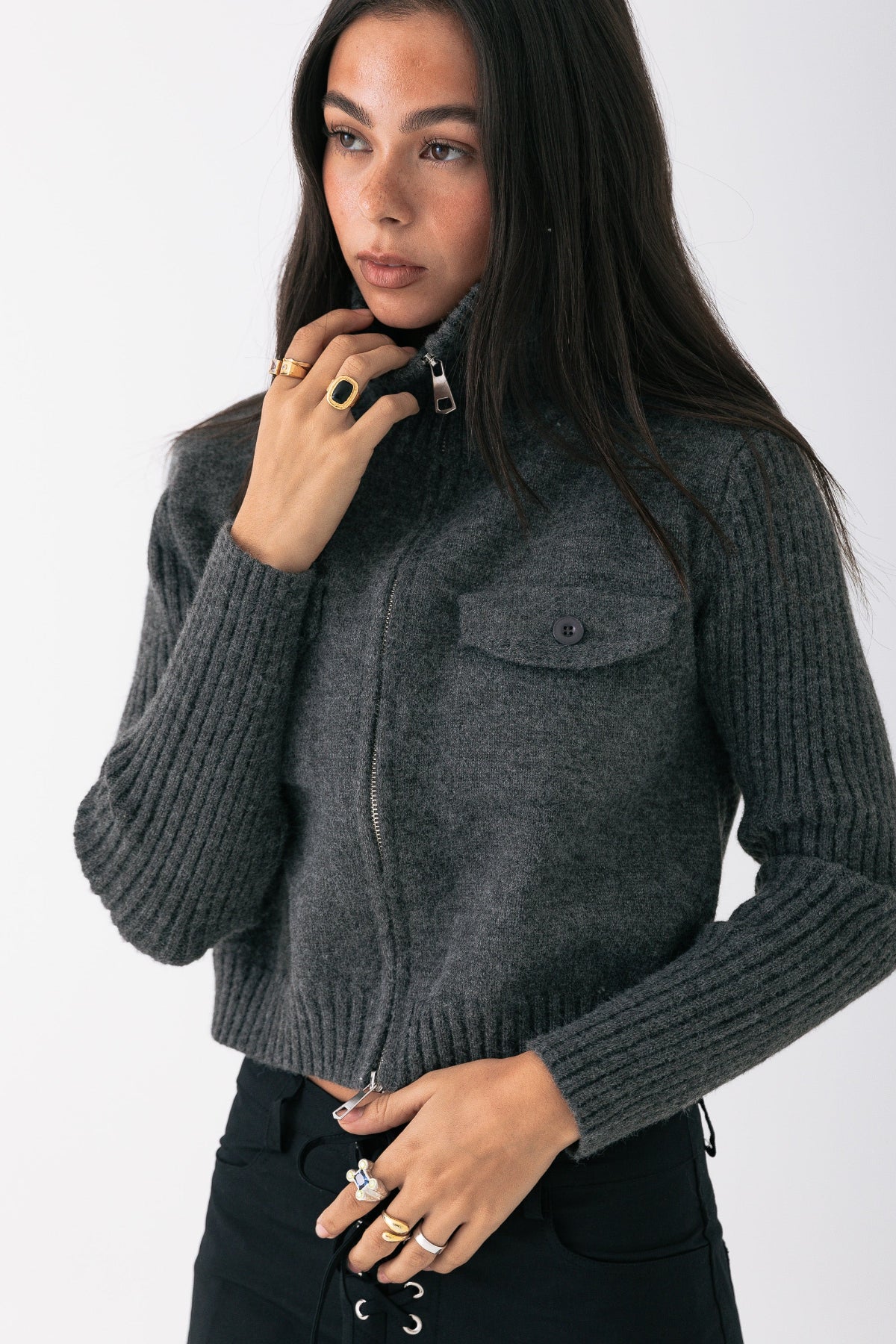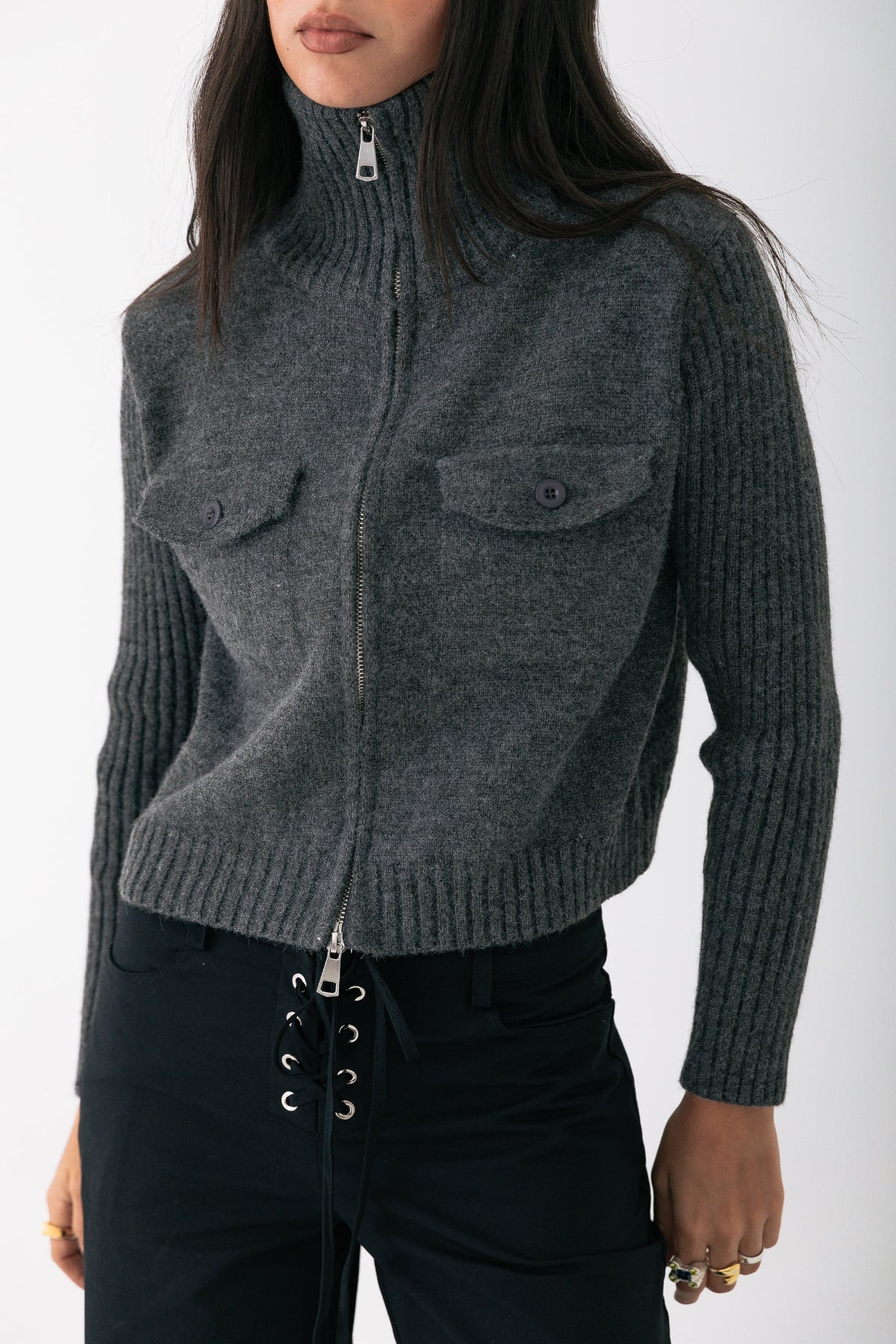 Soft structure with a modern edge. The Ivy Cardigan features a high funnel neck, double-ended zip, and ribbed sleeves with flap chest pockets. Made from a cosy knit—wear it zipped up or layered open over a mini or tailored pant.