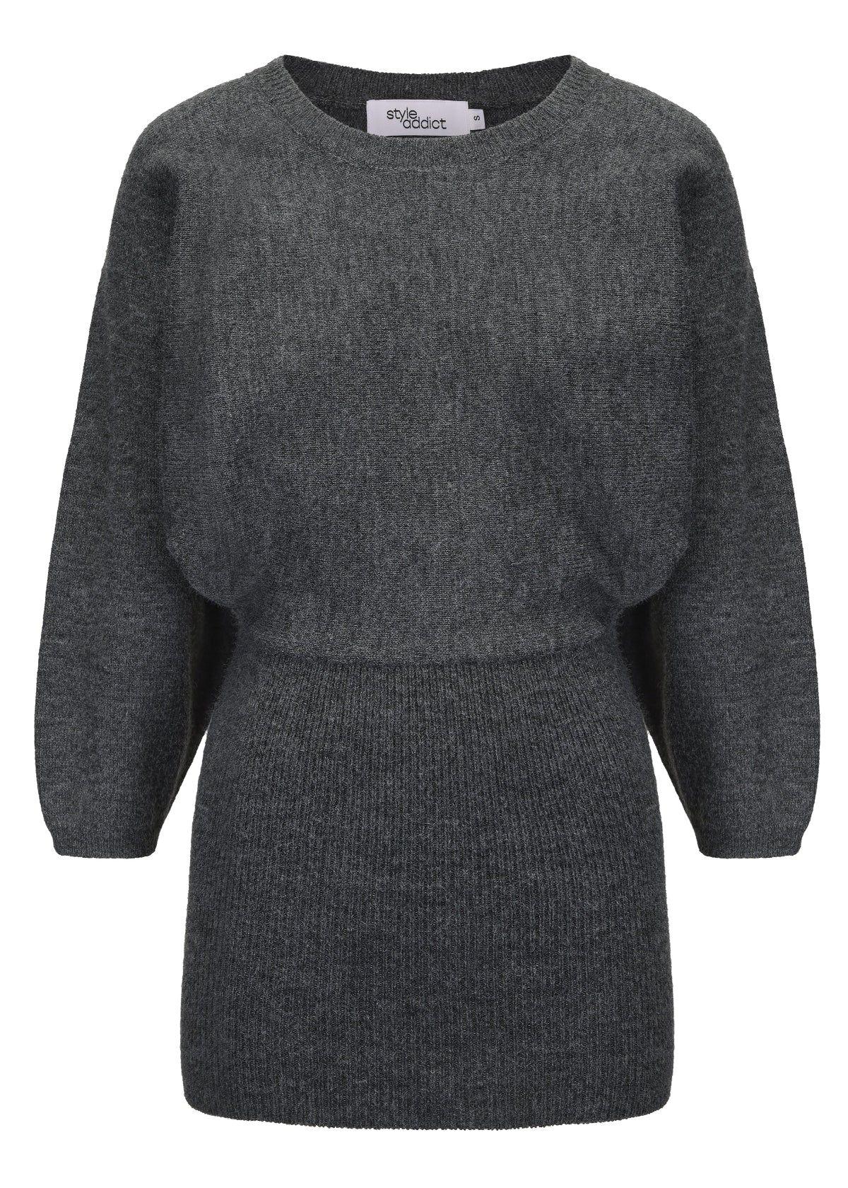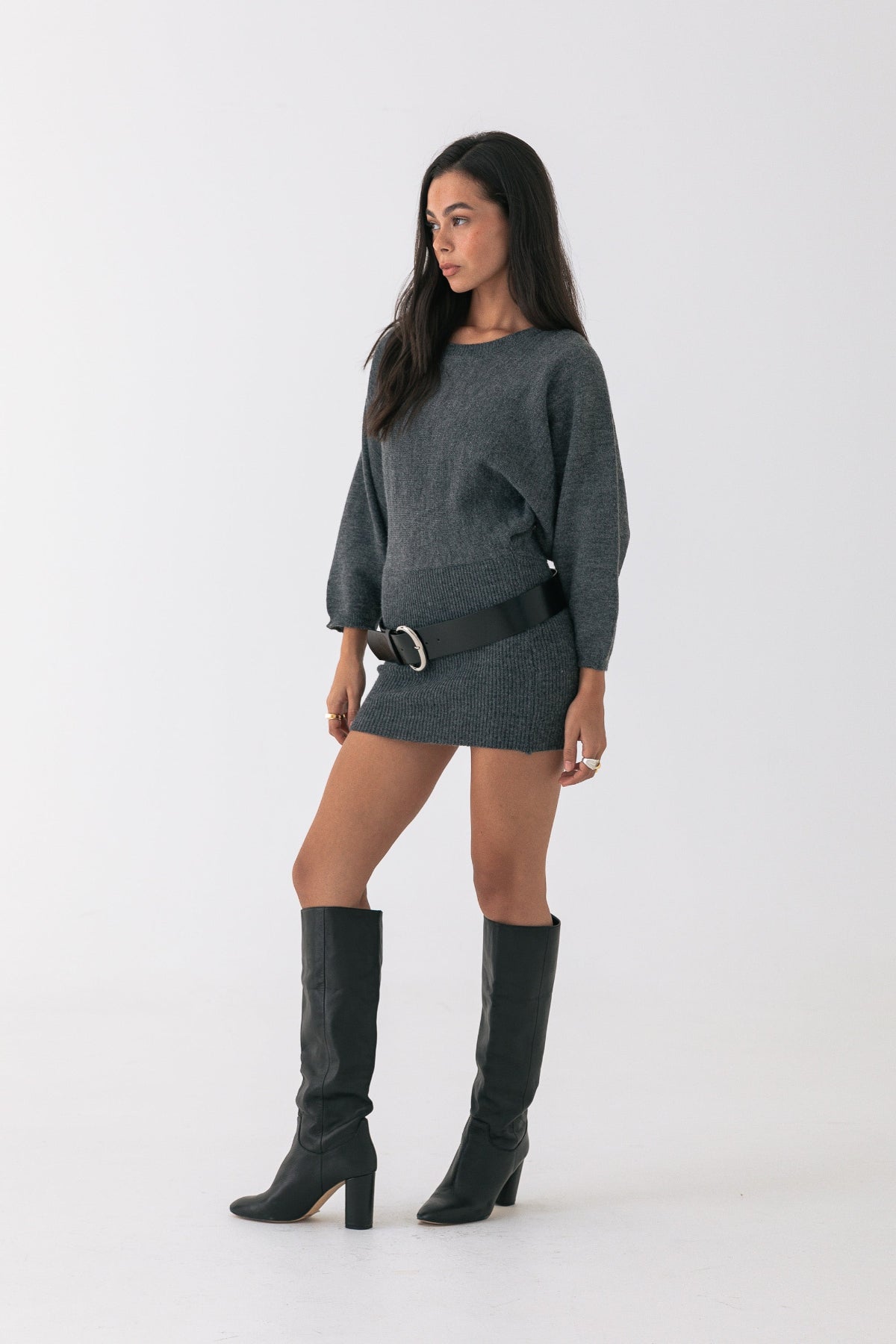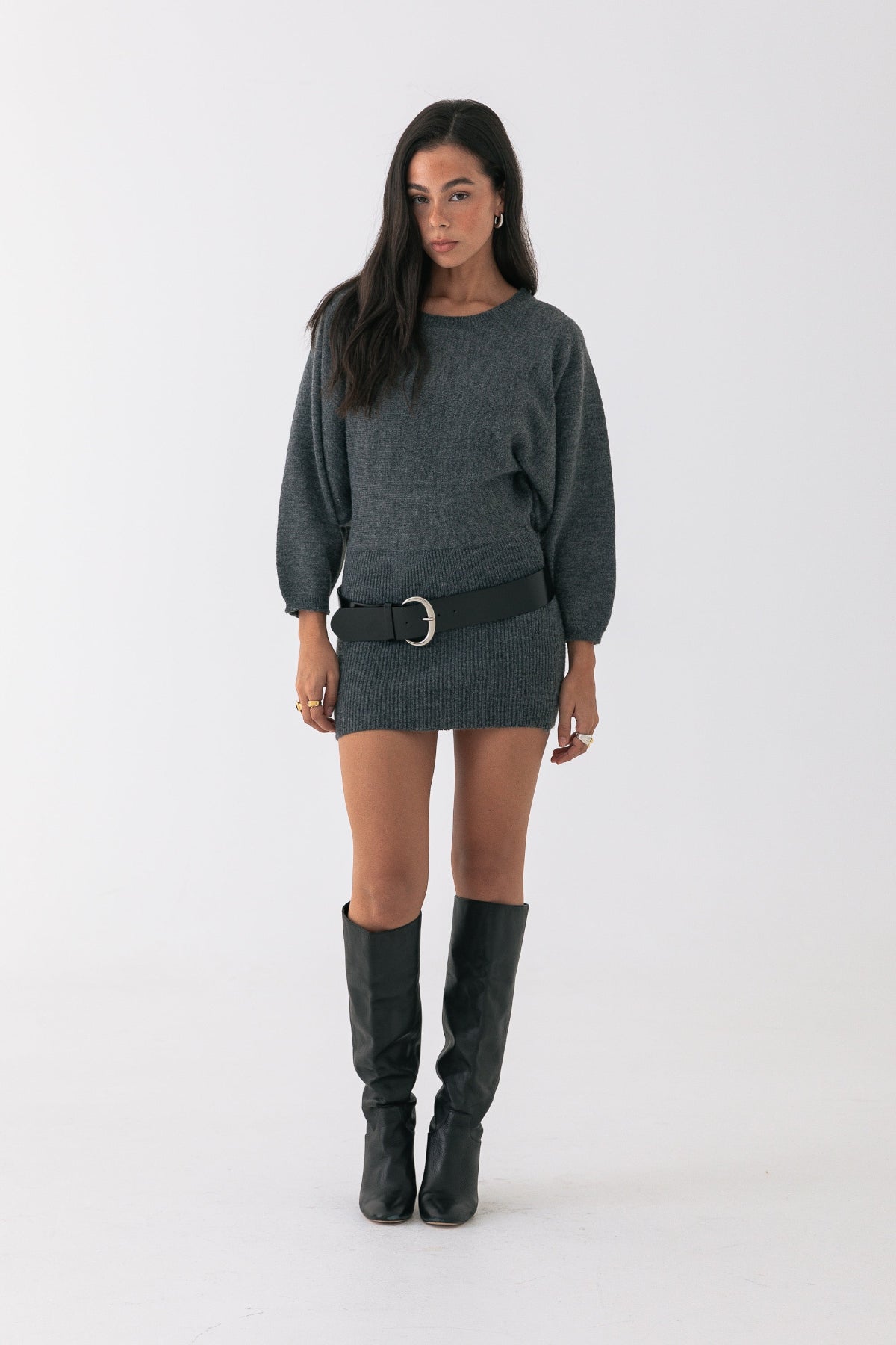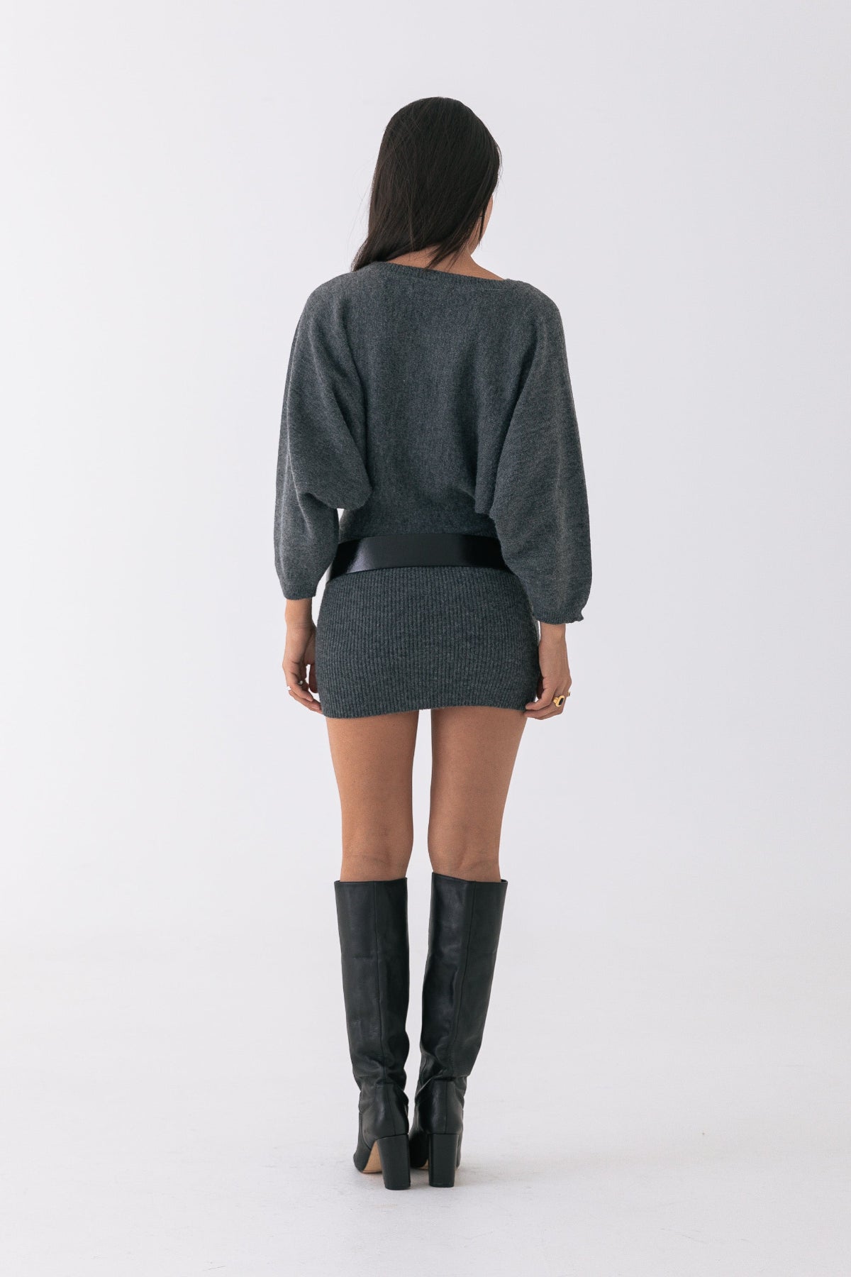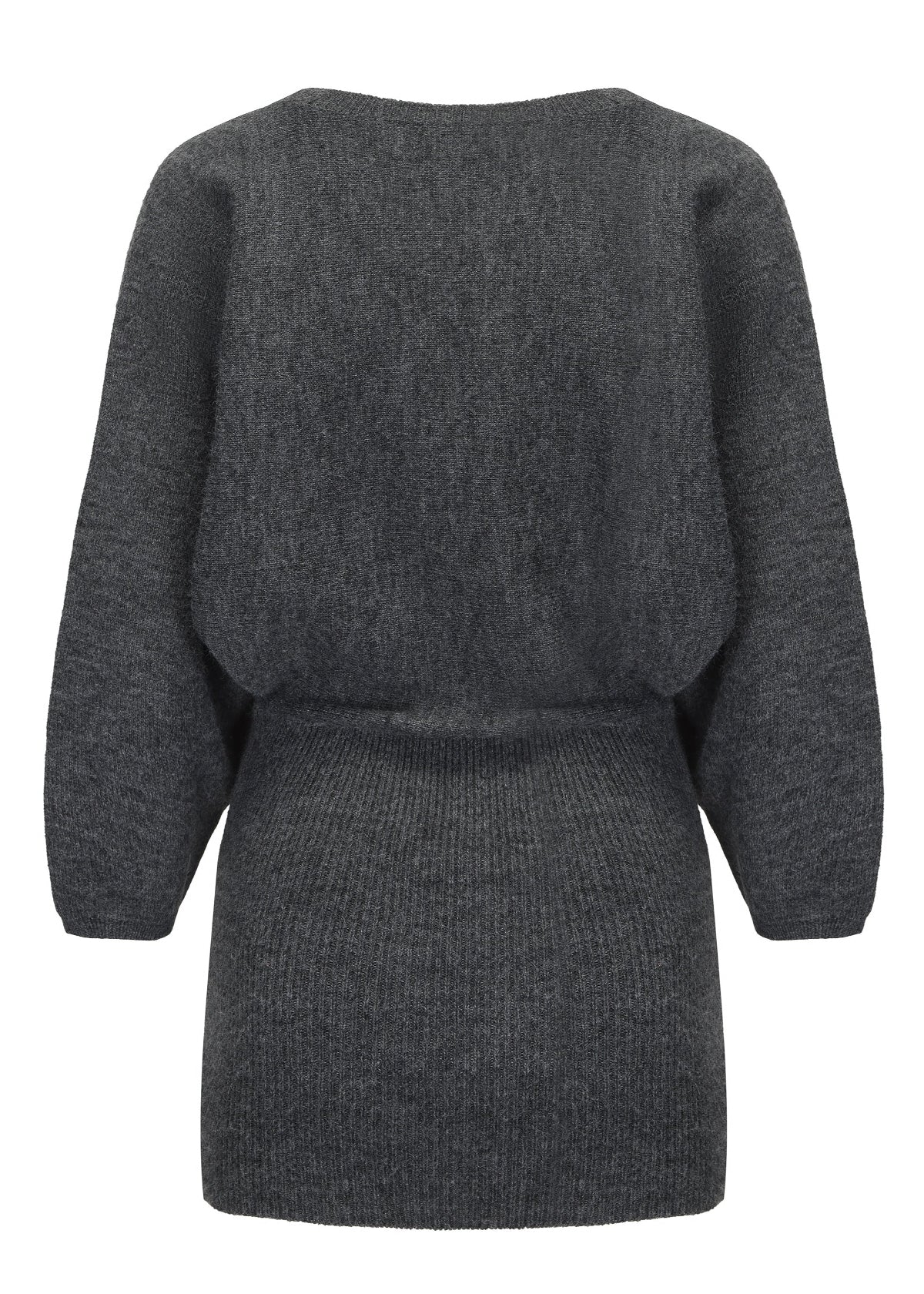 Soft, warm, and easy to throw on. This charcoal knit mini dress features a relaxed top half with a cinched ribbed waist and fitted skirt. Designed in a cosy wool blend with subtle texture throughout.
