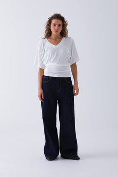 A clean, minimal wide leg jean in a deep dark wash. Designed with a high-rise waist and subtle tailored finish. Style with everything from oversized knits to simple tanks.