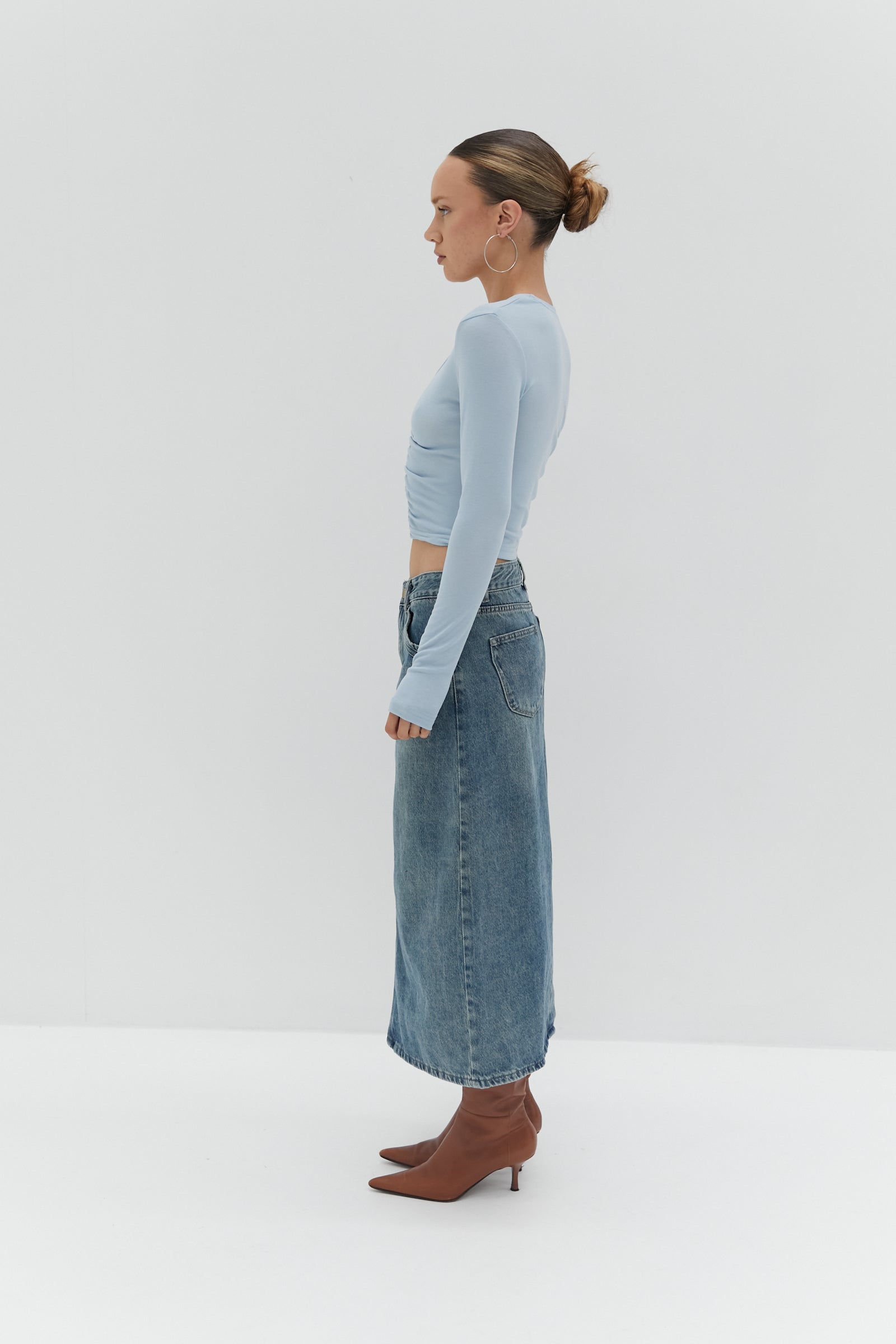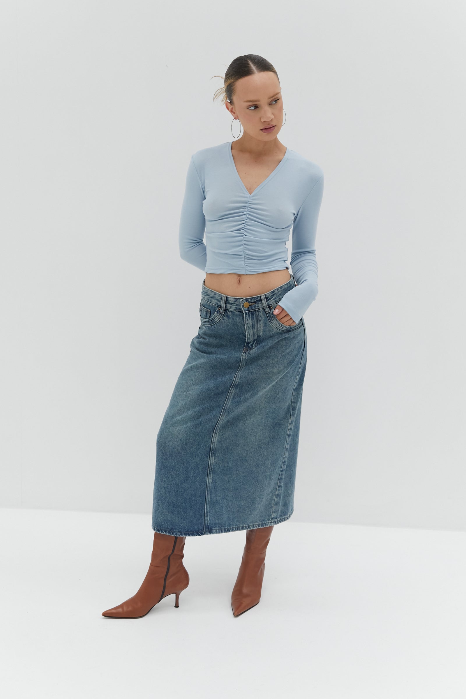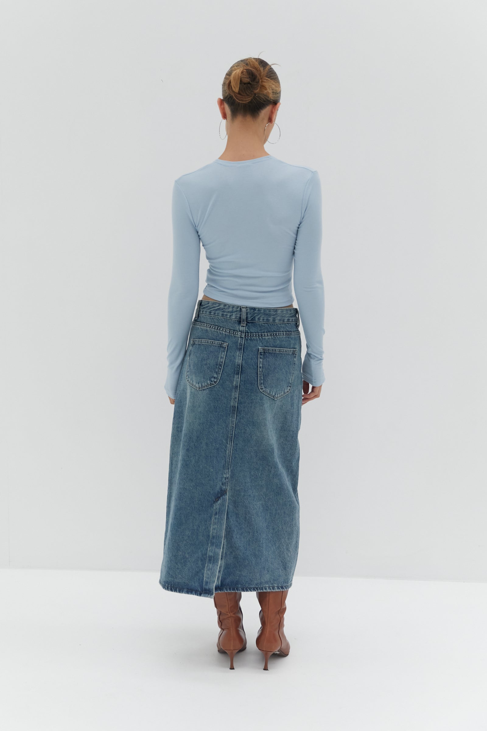 This Nicole Denim Midi Skirt is an effortless denim midi skirt design with a vintage-inspired look, back slit and functional side and back pockets.
