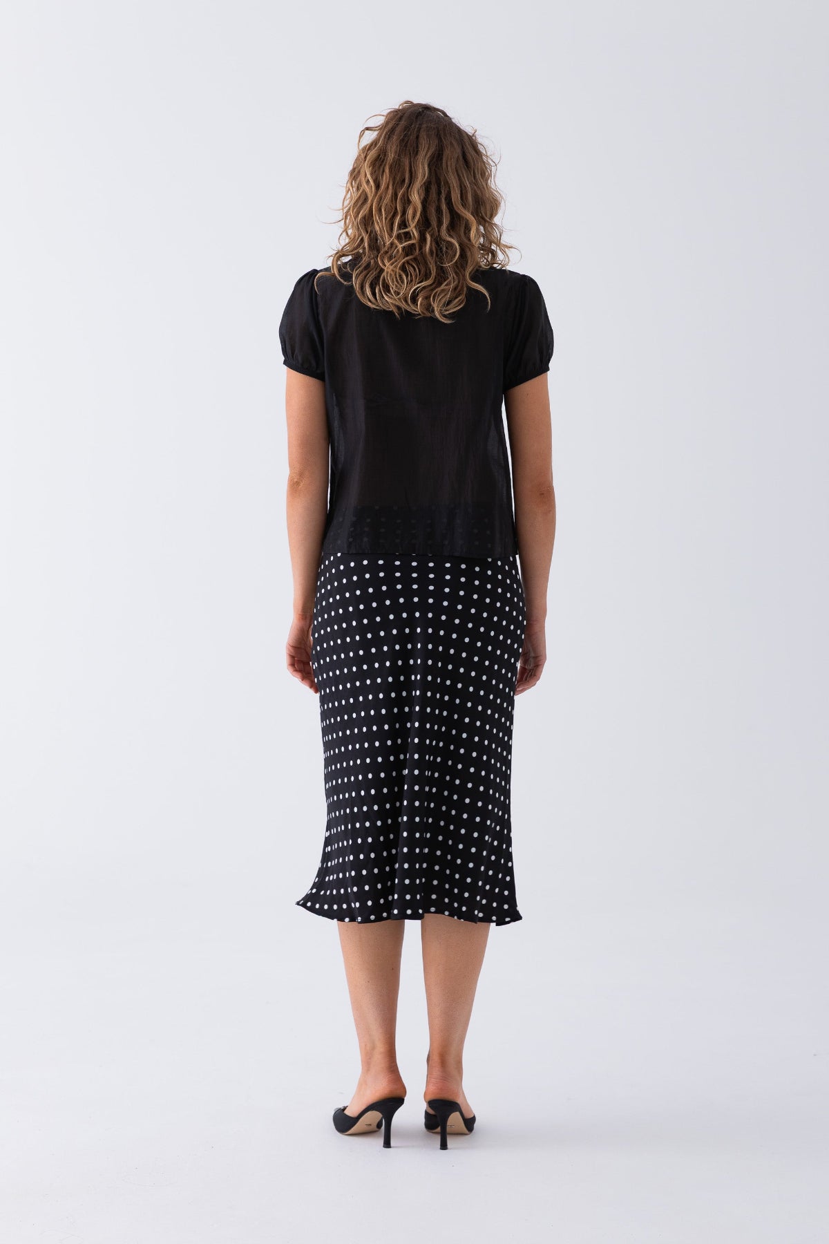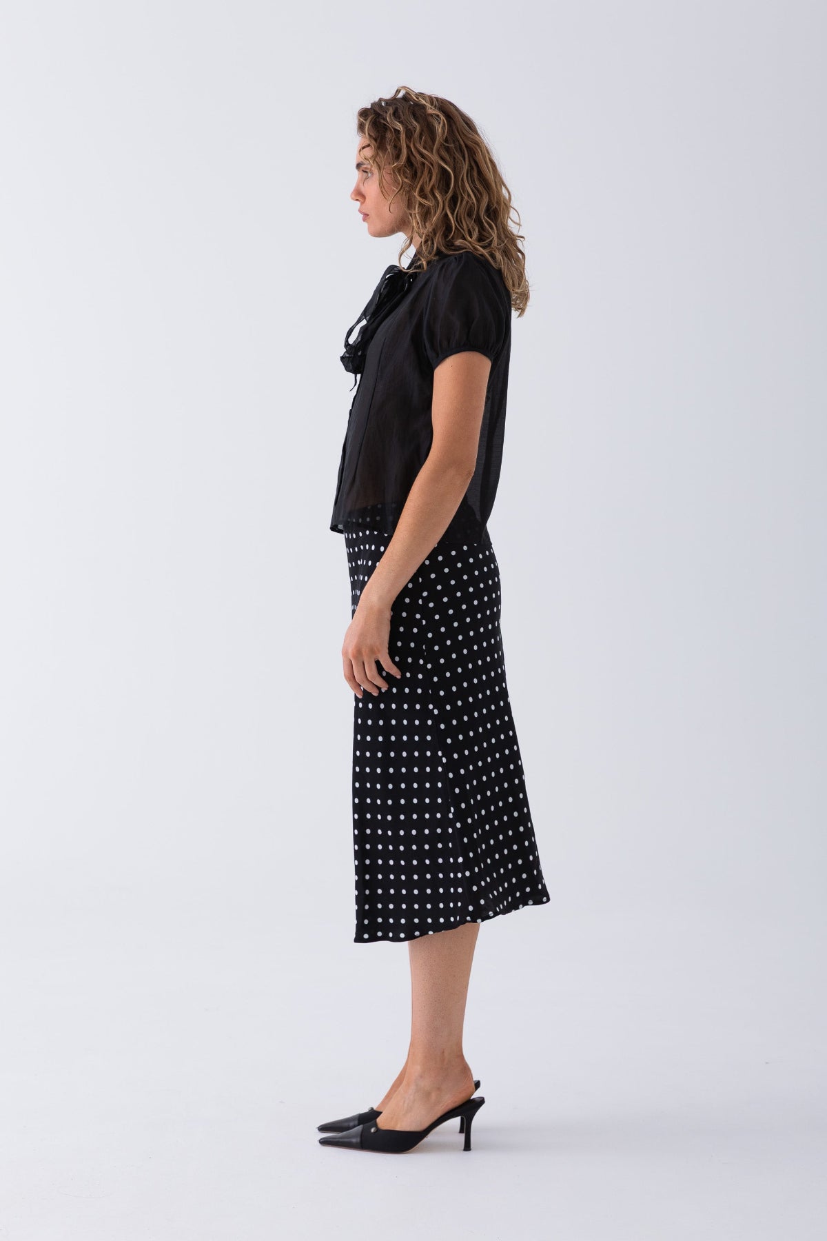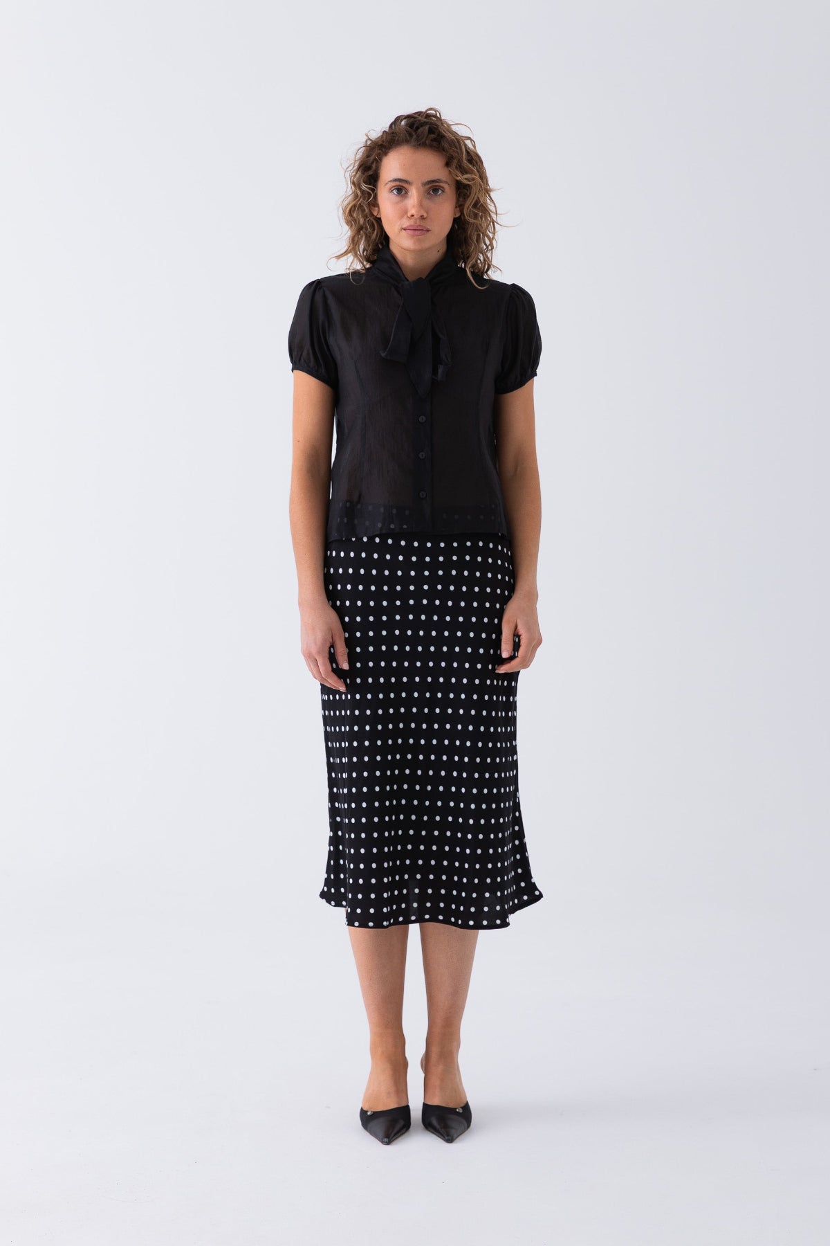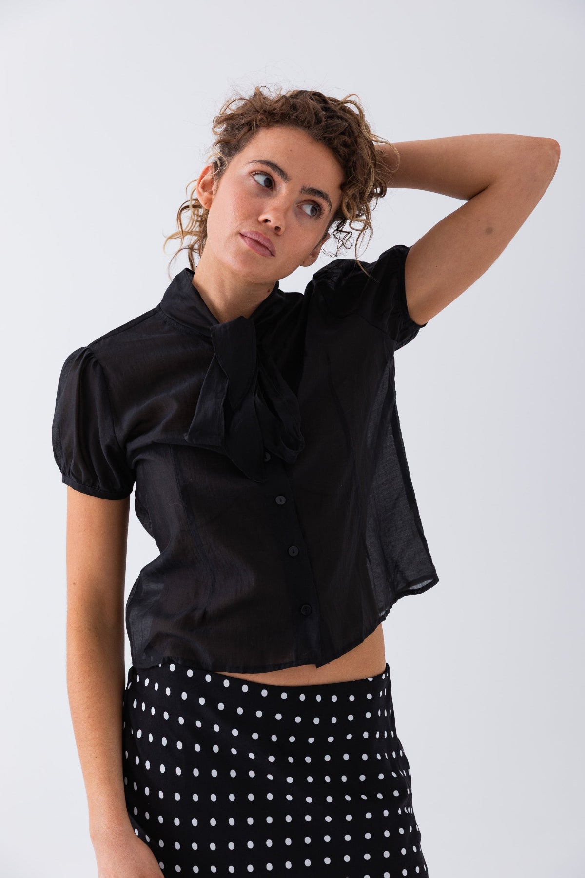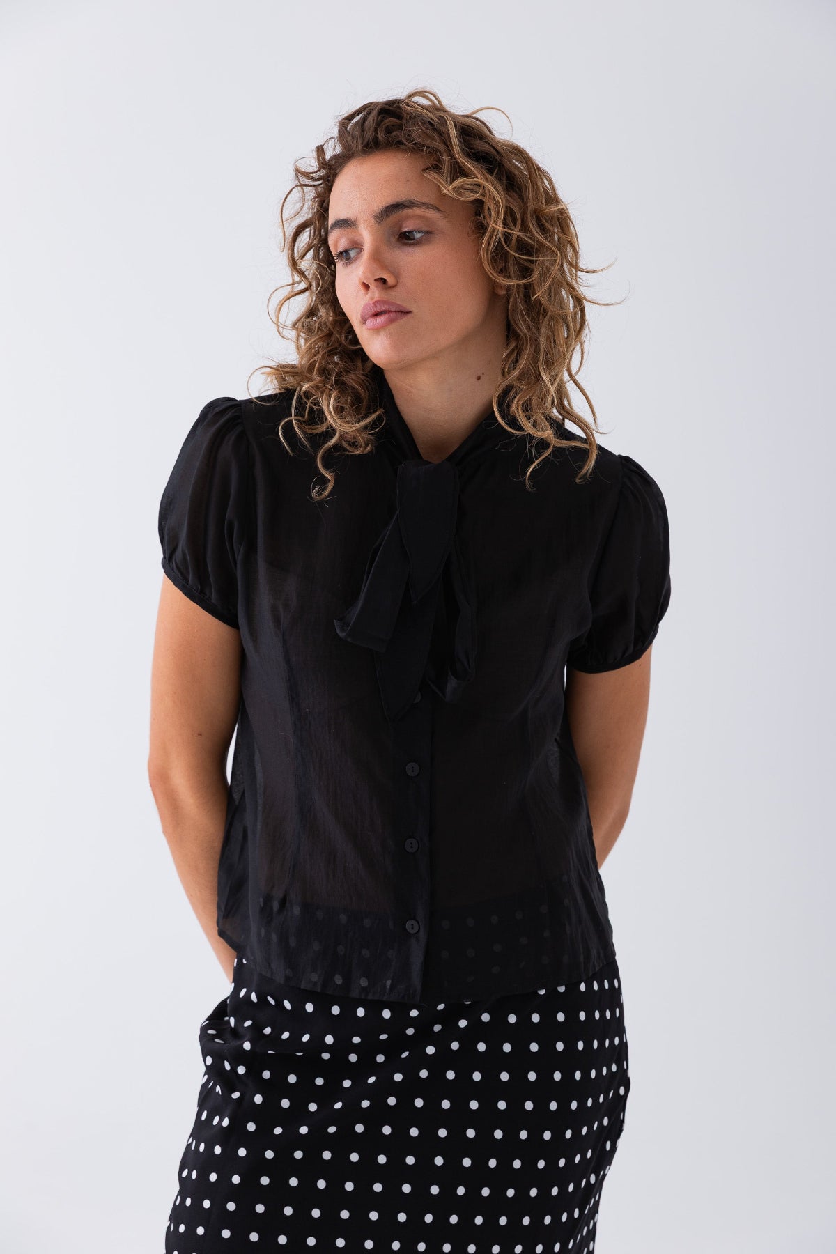 A feminine sheer blouse with a soft tie neckline and short puff sleeves. Made from a delicate semi sheer material and lightweight structure. Style it tucked into tailored trousers or a simple skirt.
