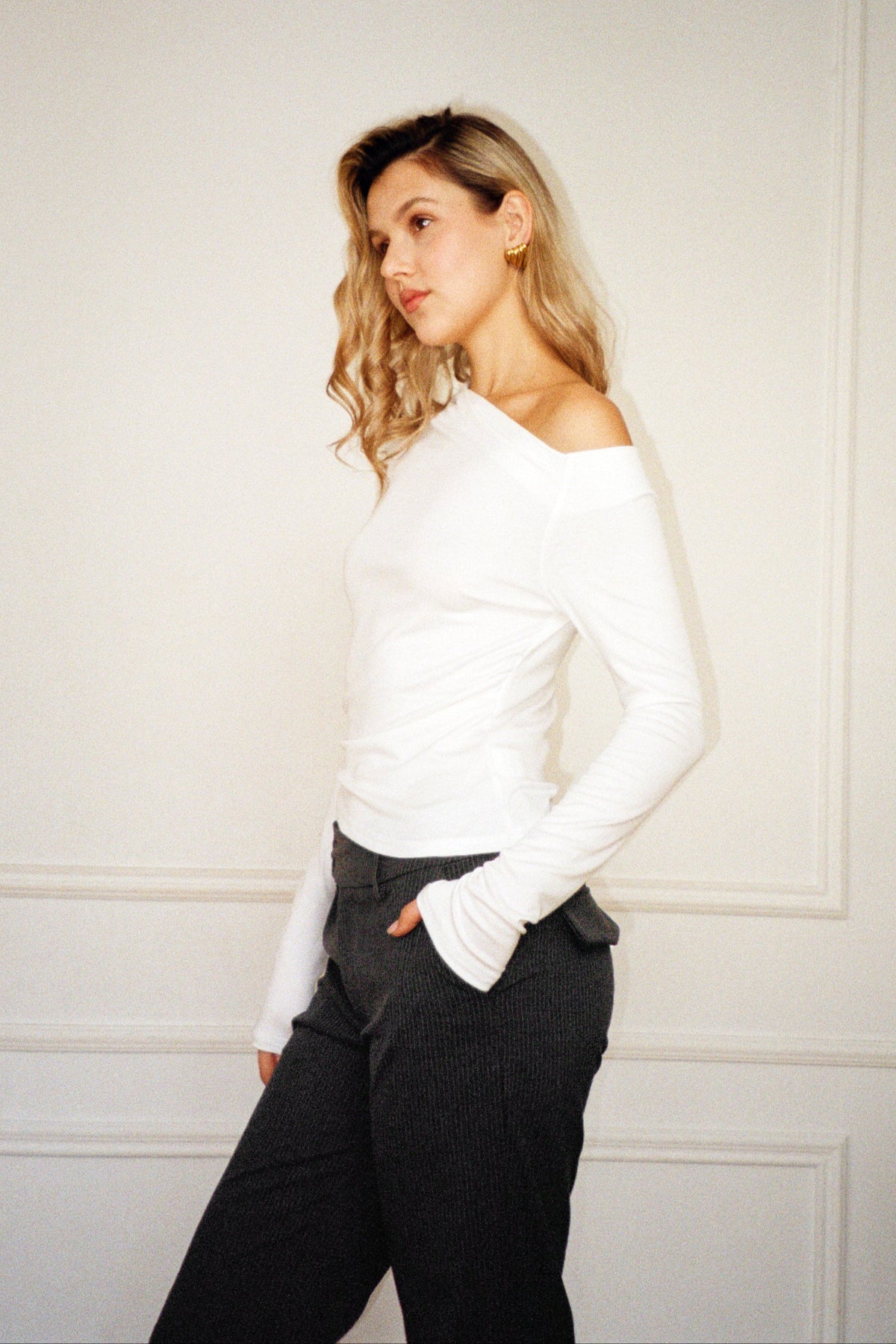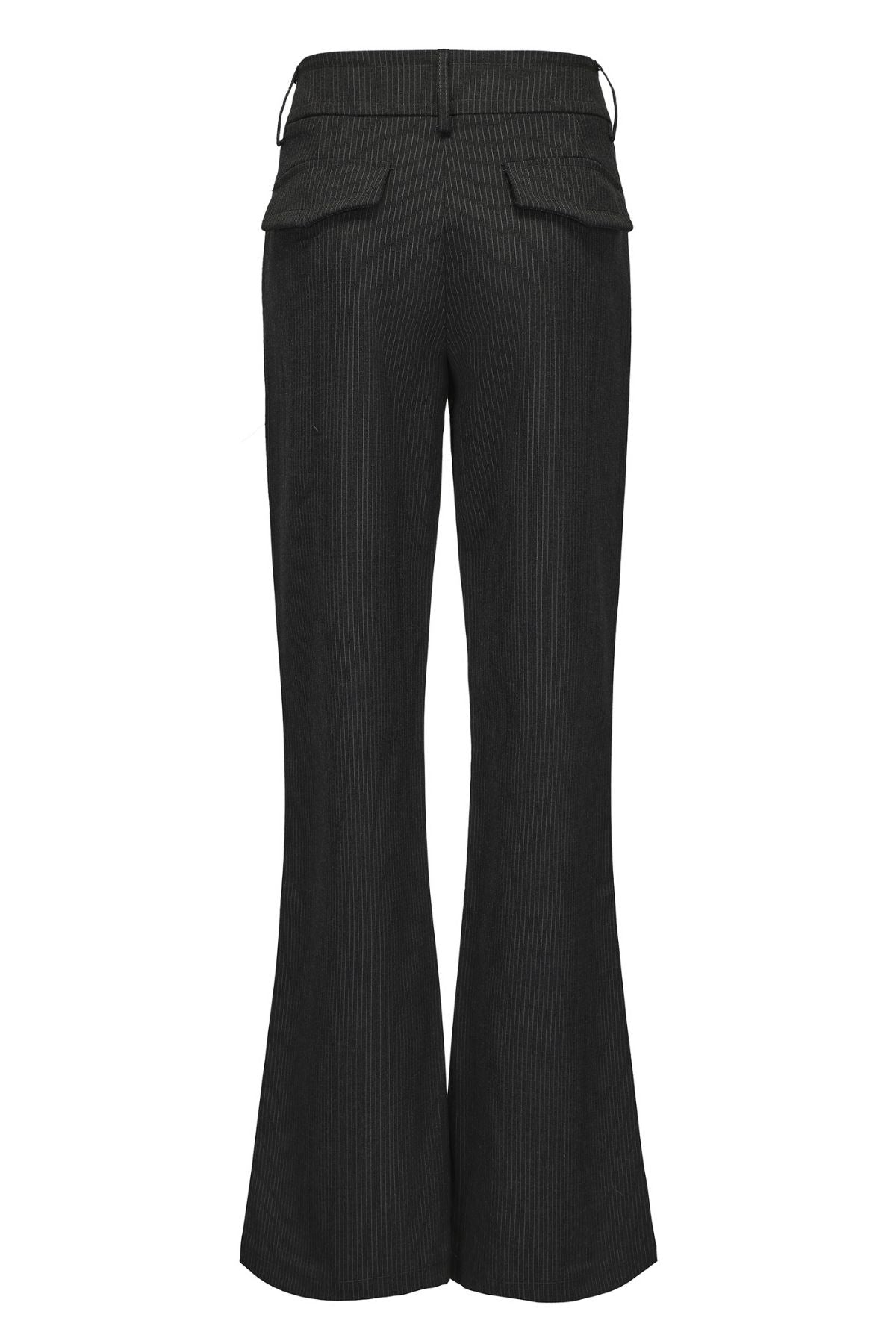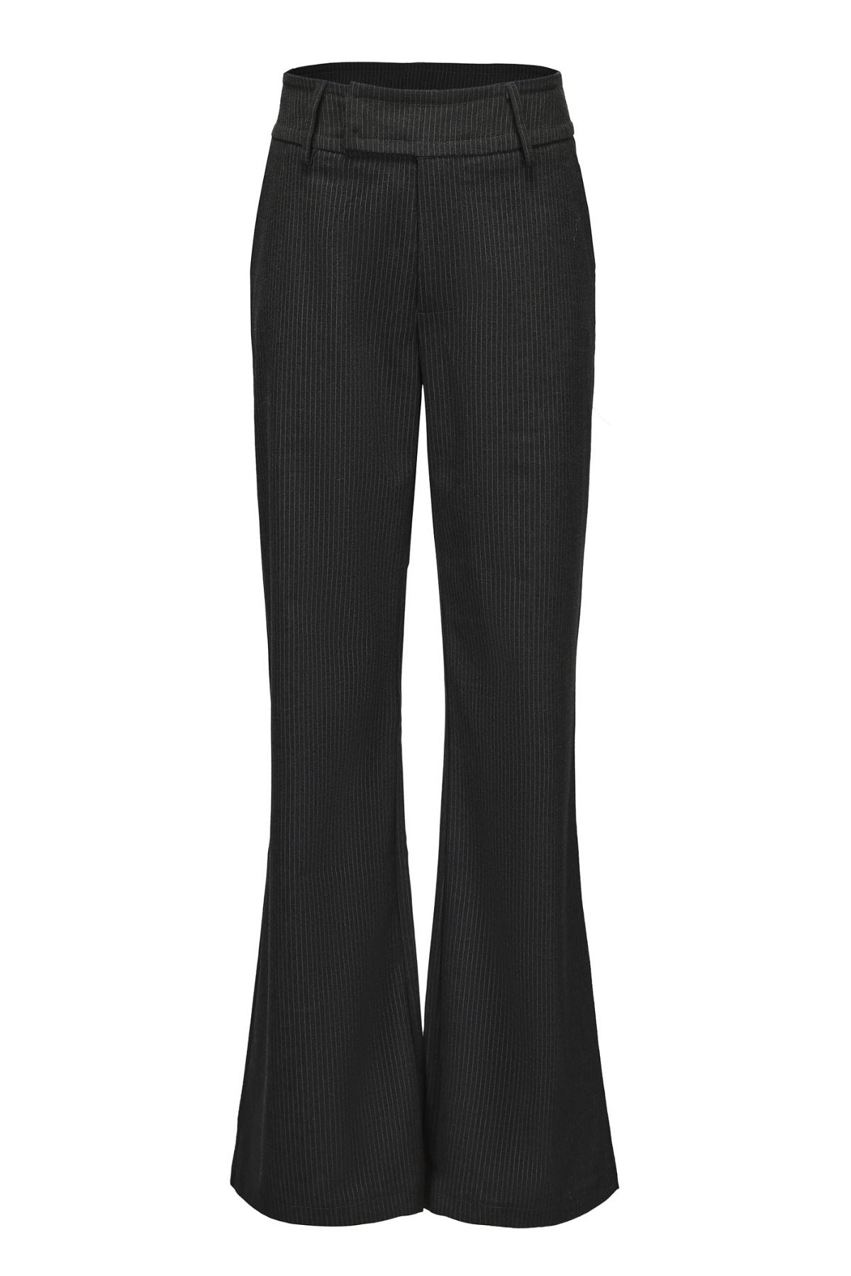 The Raye Trousers features a mid-low rise in dark grey with a subtle white pinstripe, a wide waist band and a straight leg cut.