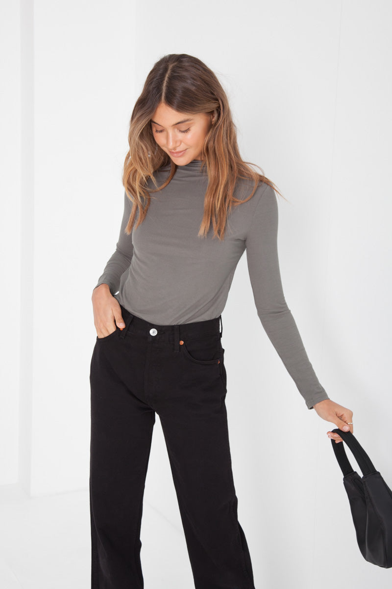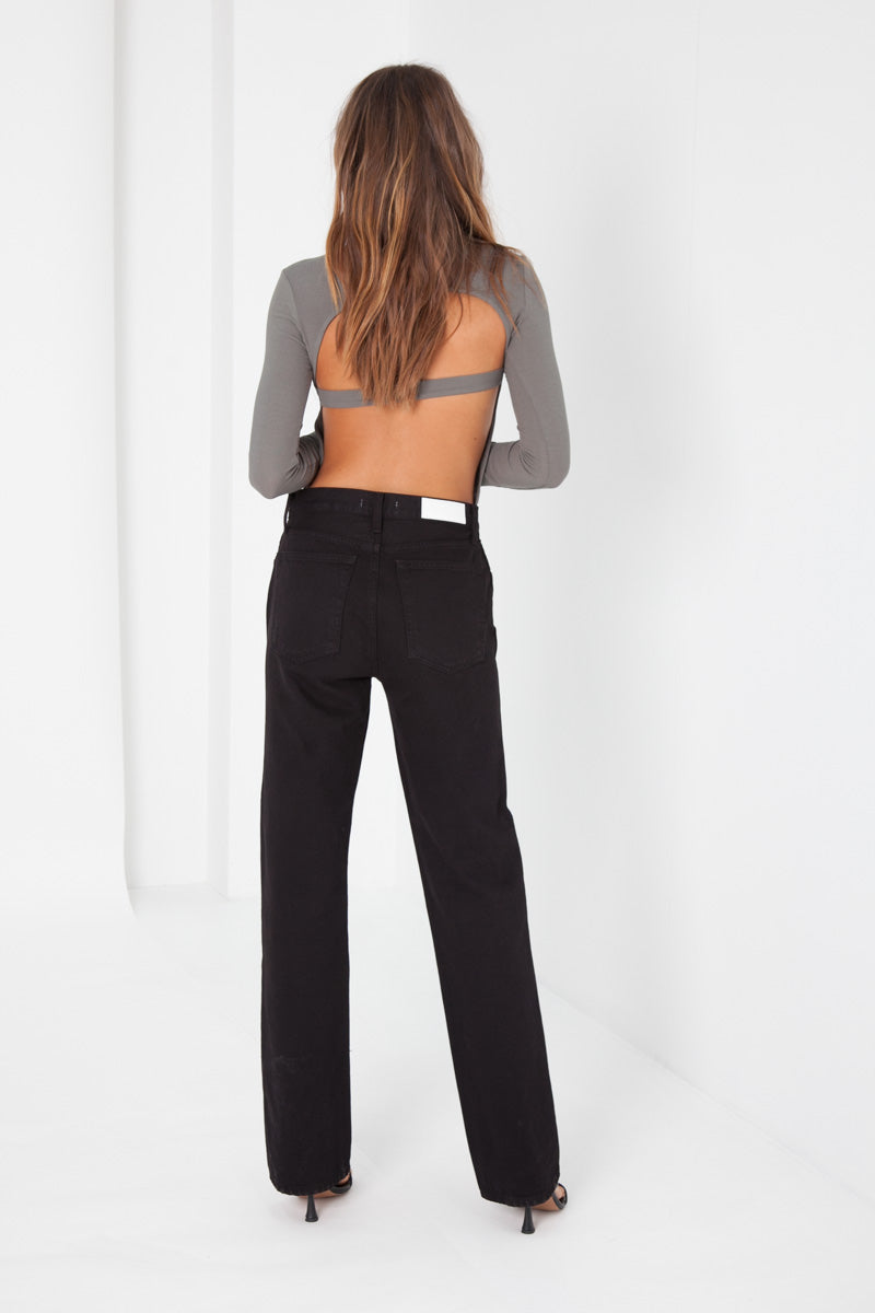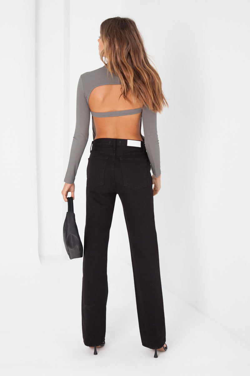The Rikki Top is cut from a lightweight cotton jersey. Featuring a mock neck with a full-length front and a cut-out open back with strap design.