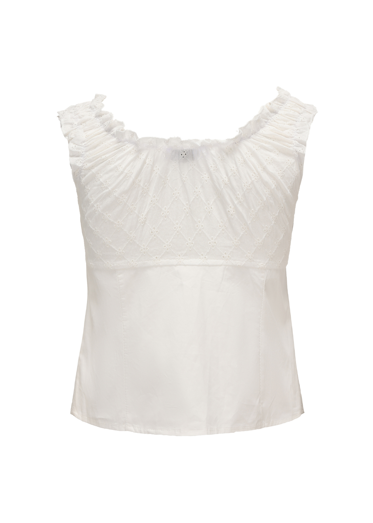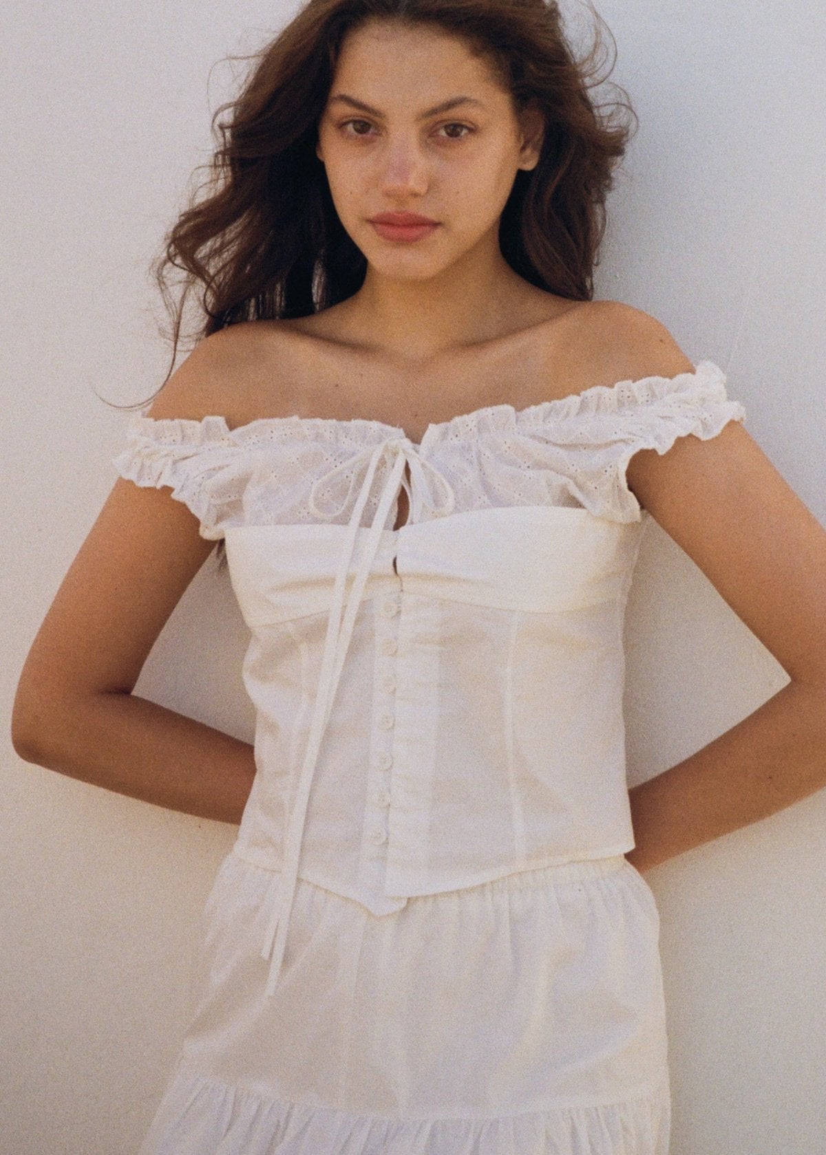 Introducing our Romy Top, a little white cotton top with lace sleeve detail. This button-front top offers versatility and can be worn on or off the shoulder, with an adjustable neckline for your desired style.