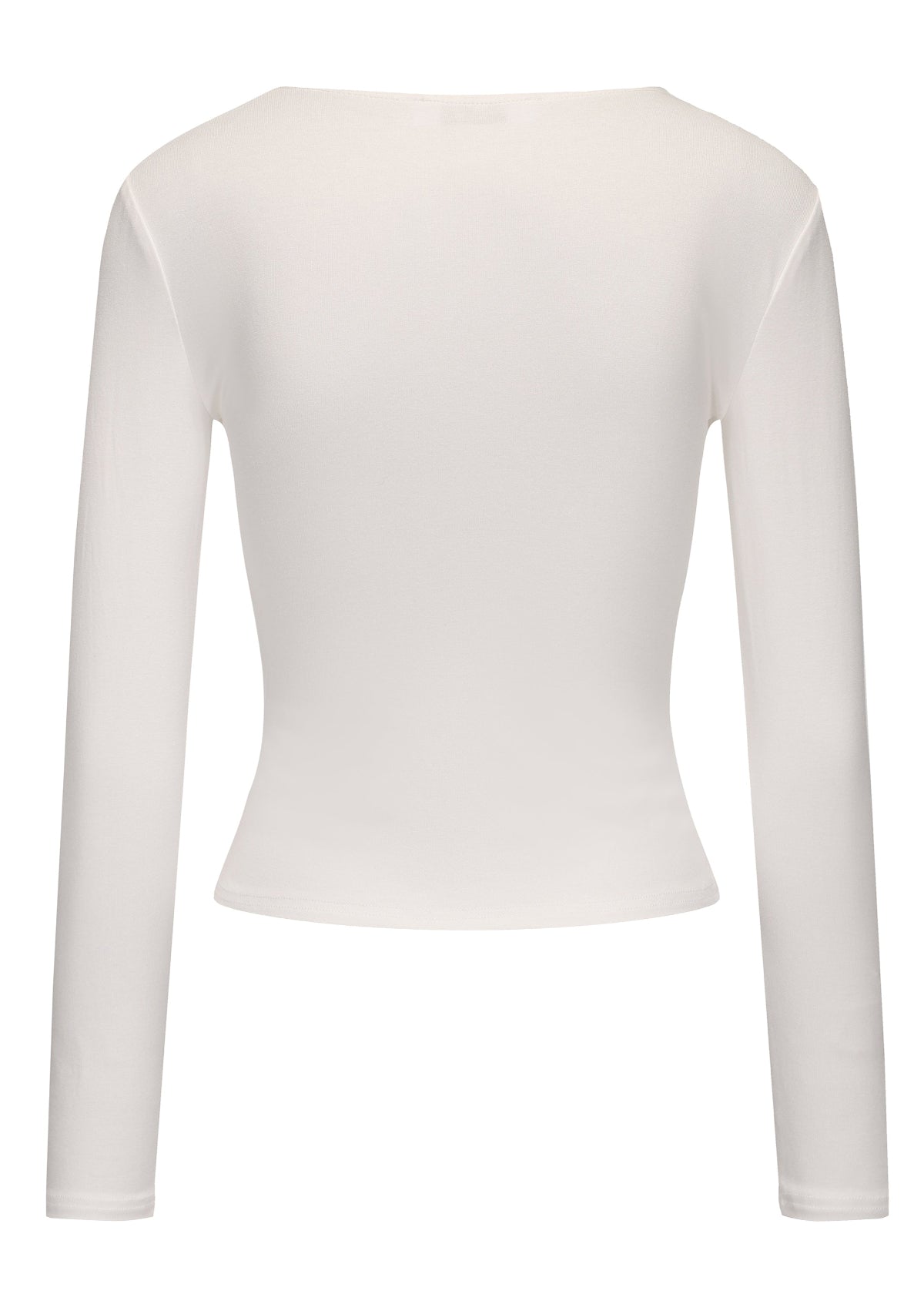 This v-neck long sleeve white top features a hook eye front closure, soft stretch fabric, slightly cropped length and seam detail under the bust for a flattering fit.